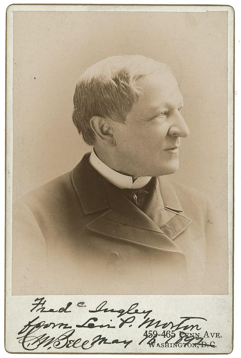 Original vintage 4.25 x 6.5 cabinet photo by C. M. Bell of Washington, D. C., signed and inscribed in fountain pen “Fred C. Ingley from Levi P. Morton, May 16, 1892.” In fine condition, with some light soiling to lower edge, and some scattered light spotting to image. Provenance: The Barry Hoffman Collection.