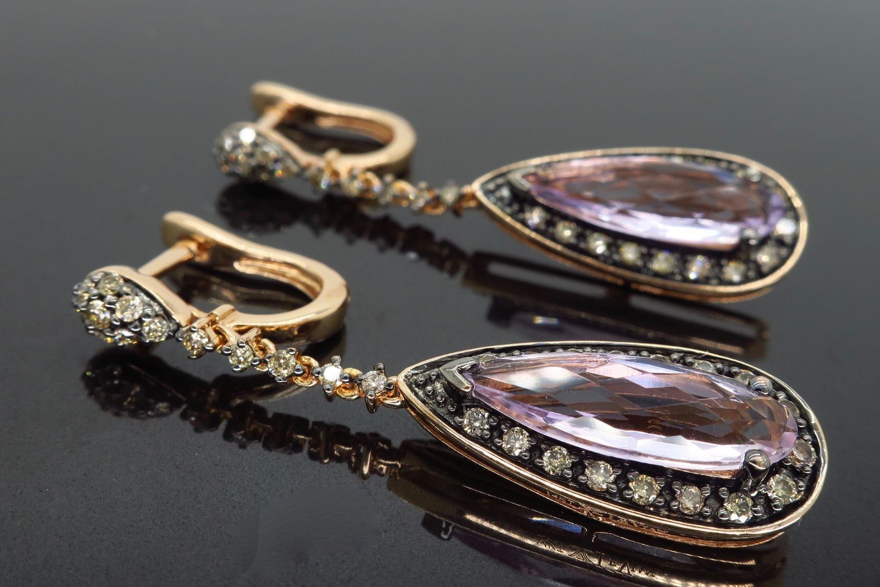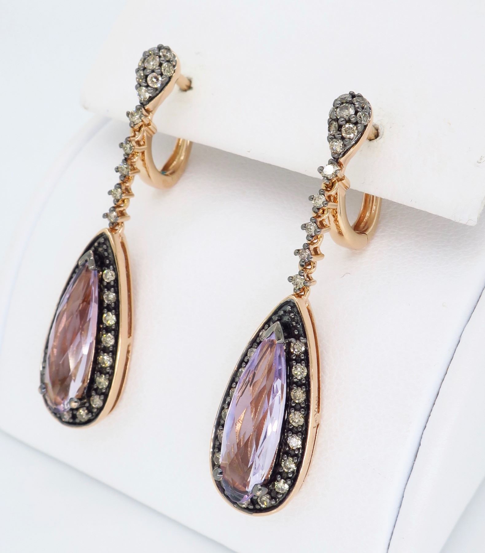One Levian 14KT Rose Gold Amethyst and Diamond Earrings. (2) Elongated pear shaped amethyst stones measuring 15.5mm x 6mm. (60) round chocolate colored diamonds with a total weight of 0.60cts with a clarity of SI-1 to SI-2. Approximatley 1.5 inches in length. Total weight of these earrings are 8 grams.