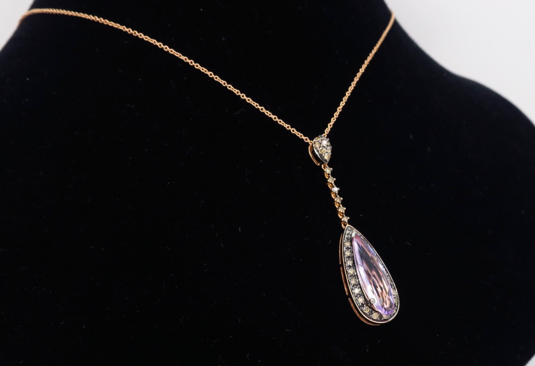 One Levian 14KT Rose Gold Amethyst and Diamond Pendant with Chain. (1) Elongated pear shaped amethyst stone measuring 19mm x 6mm. (33) round chocolate color diamonds with a total weight of 0.375cts with a clarity of SI-1 to SI-2. Total length of this chain is 17.5 inches. Total weight of this pendant is 5.5 grams.