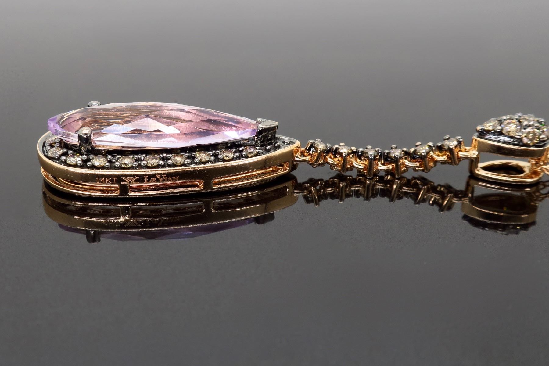 One Levian 14KT Rose Gold Amethyst and Diamond Pendant with Chain. (1) Elongated pear shaped amethyst stone measuring 19mm x 6mm. (33) round chocolate color diamonds with a total weight of 0.375cts with a clarity of SI-1 to SI-2. Total length of this chain is 17.5 inches. Total weight of this pendant is 5.5 grams.