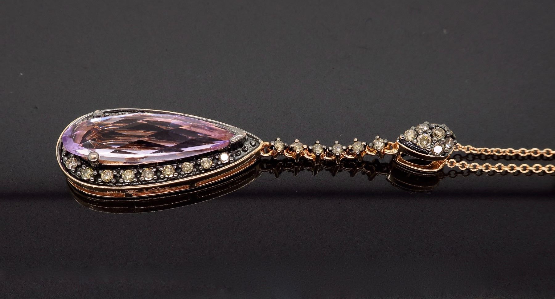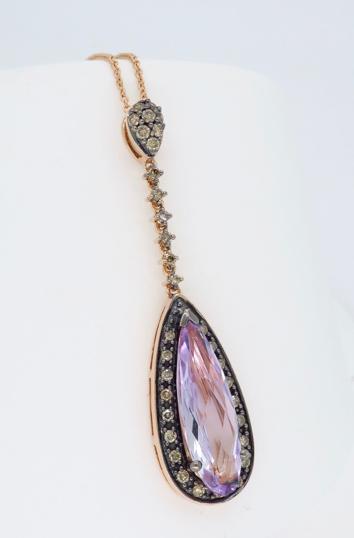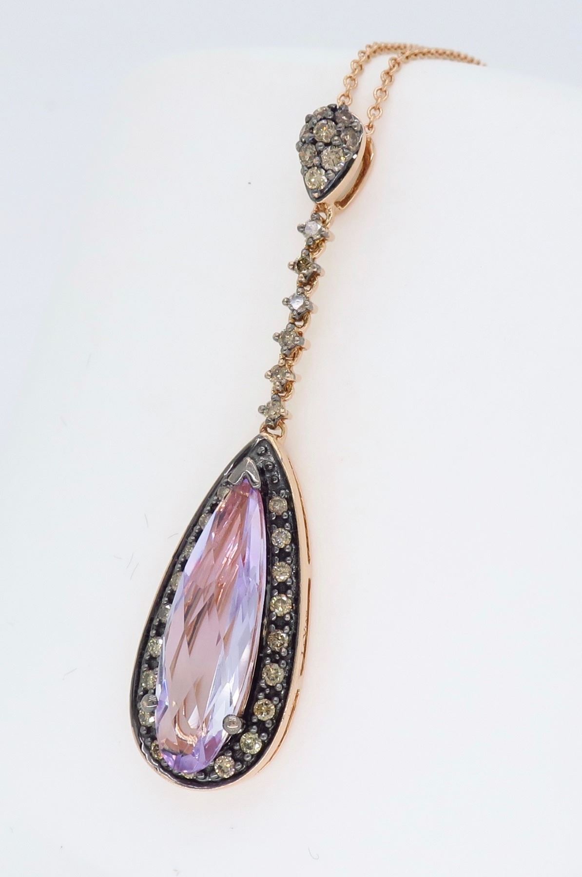 One Levian 14KT Rose Gold Amethyst and Diamond Pendant with Chain. (1) Elongated pear shaped amethyst stone measuring 19mm x 6mm. (33) round chocolate color diamonds with a total weight of 0.375cts with a clarity of SI-1 to SI-2. Total length of this chain is 17.5 inches. Total weight of this pendant is 5.5 grams.