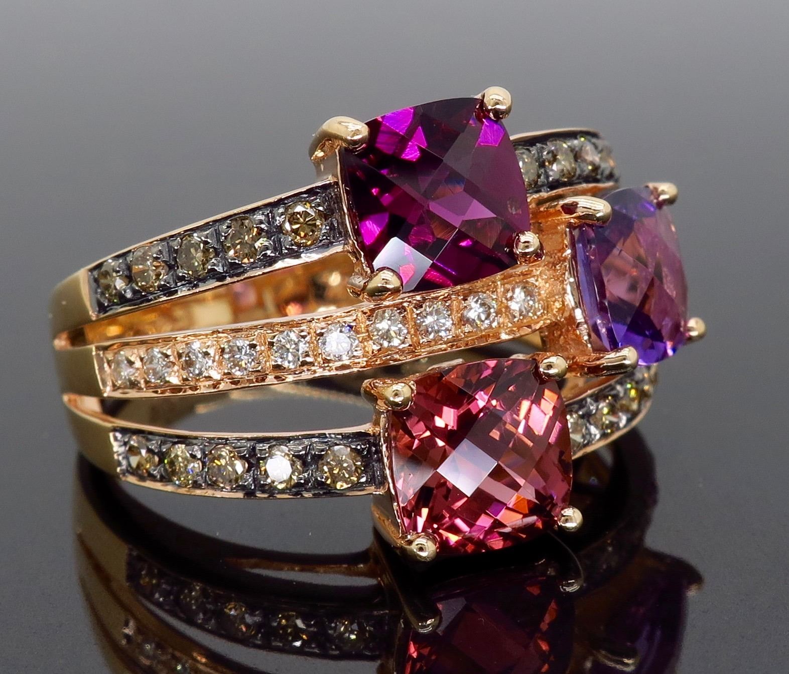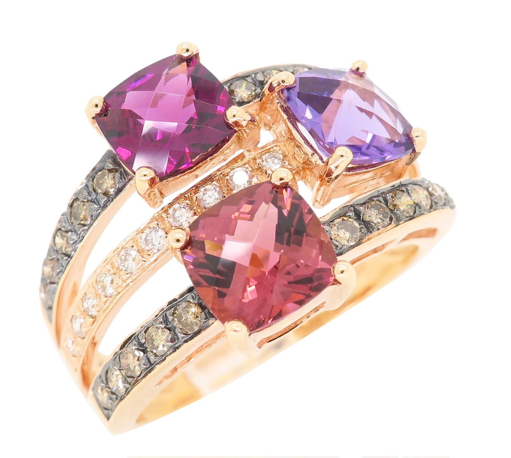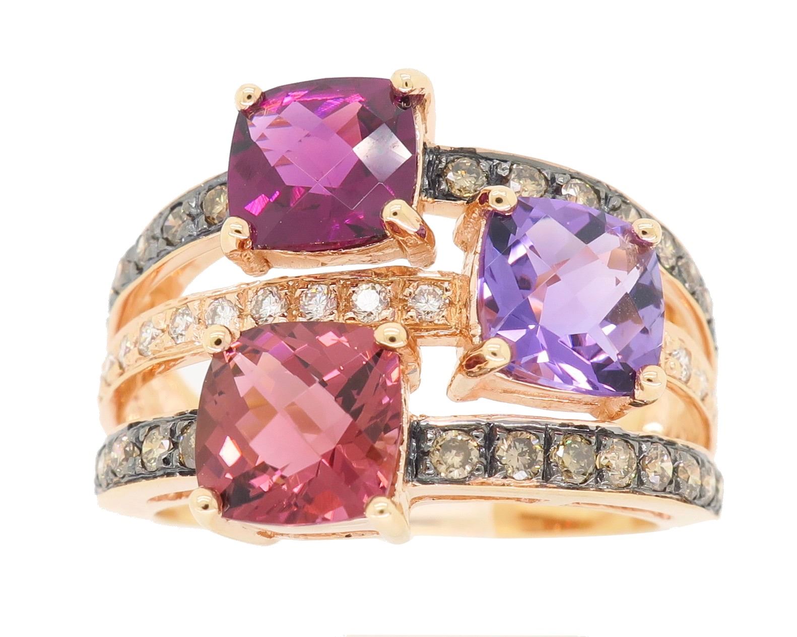 One Levian 14KT Rose Gold Colored Stones and Diamond Ring. One Cushion Shaped Rhodolite, Cushion Shaped Tourmaline and Cushion Shaped Amethyst stone. (14) Round Diamonds with a color of H-I and clarity of SI-2 and (26) chocolate Diamonds with a clarity of SI-2 with a total Diamond weight of 0.45cts. Total weight of this ring is 5.6 grams. Ring size is 7.