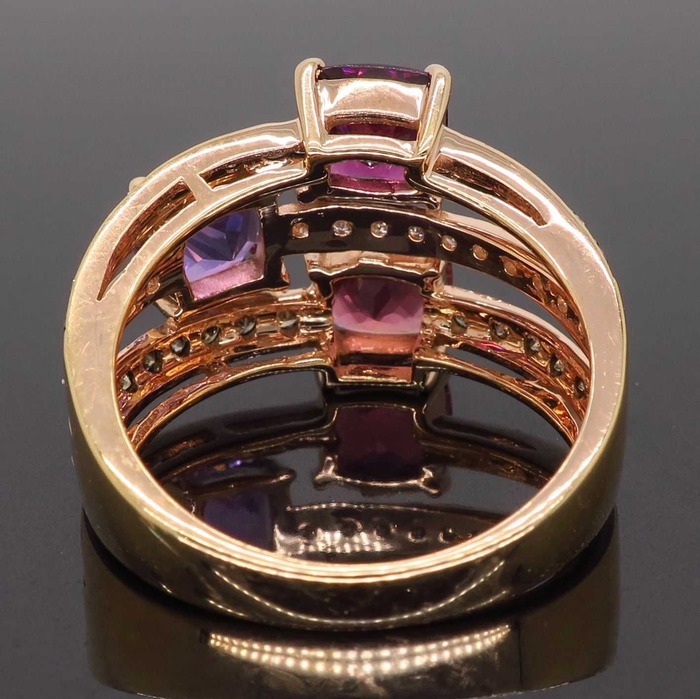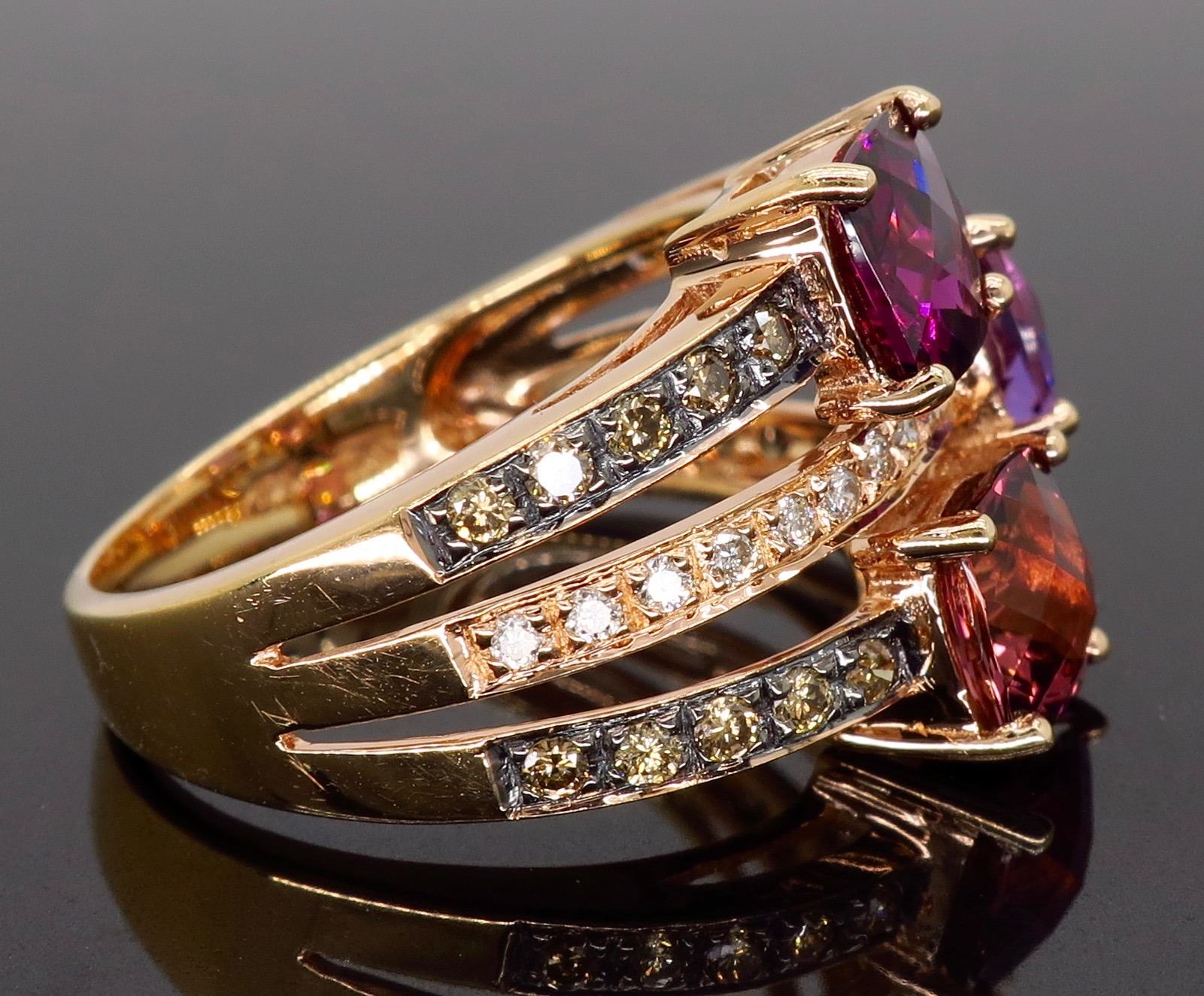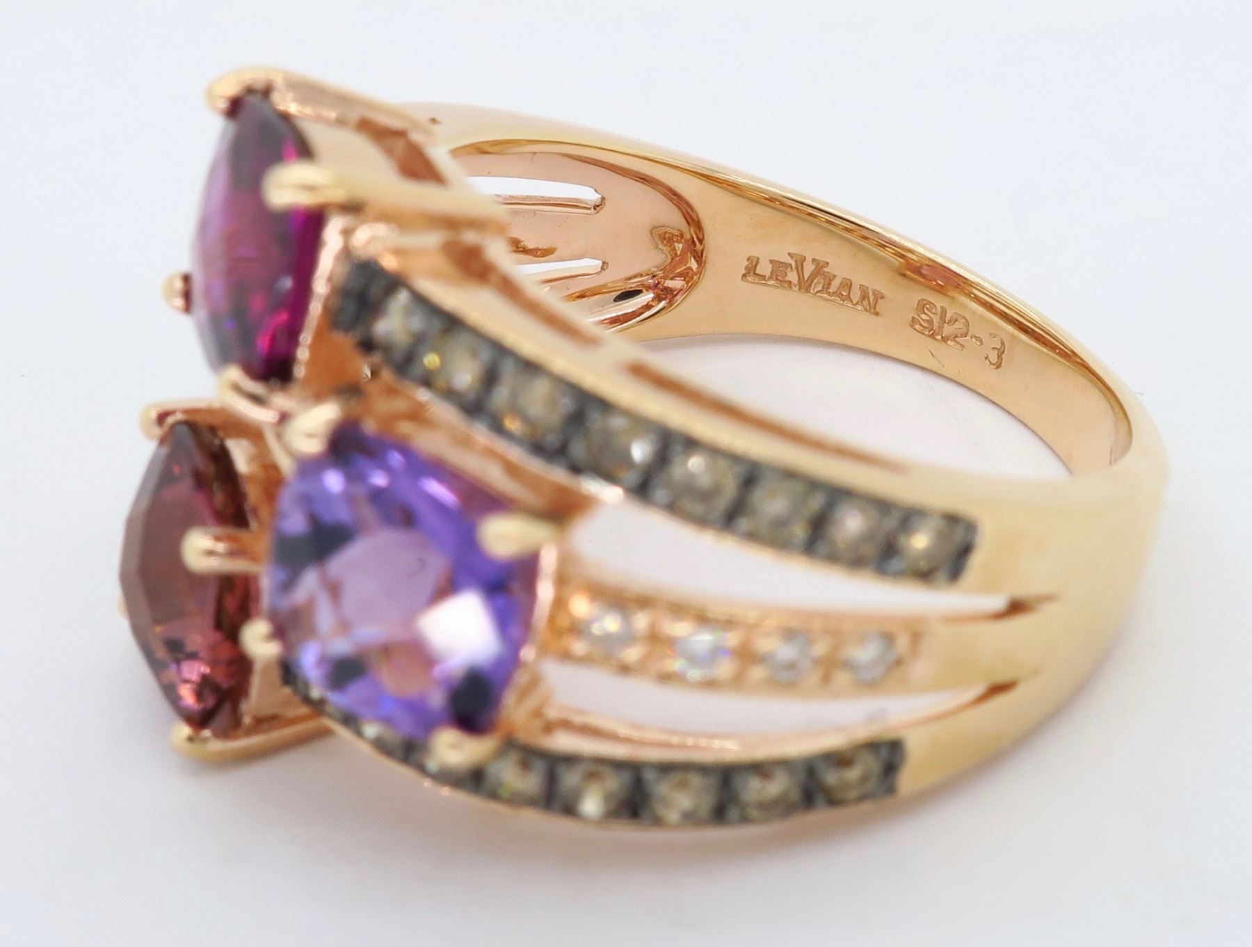 One Levian 14KT Rose Gold Colored Stones and Diamond Ring. One Cushion Shaped Rhodolite, Cushion Shaped Tourmaline and Cushion Shaped Amethyst stone. (14) Round Diamonds with a color of H-I and clarity of SI-2 and (26) chocolate Diamonds with a clarity of SI-2 with a total Diamond weight of 0.45cts. Total weight of this ring is 5.6 grams. Ring size is 7.