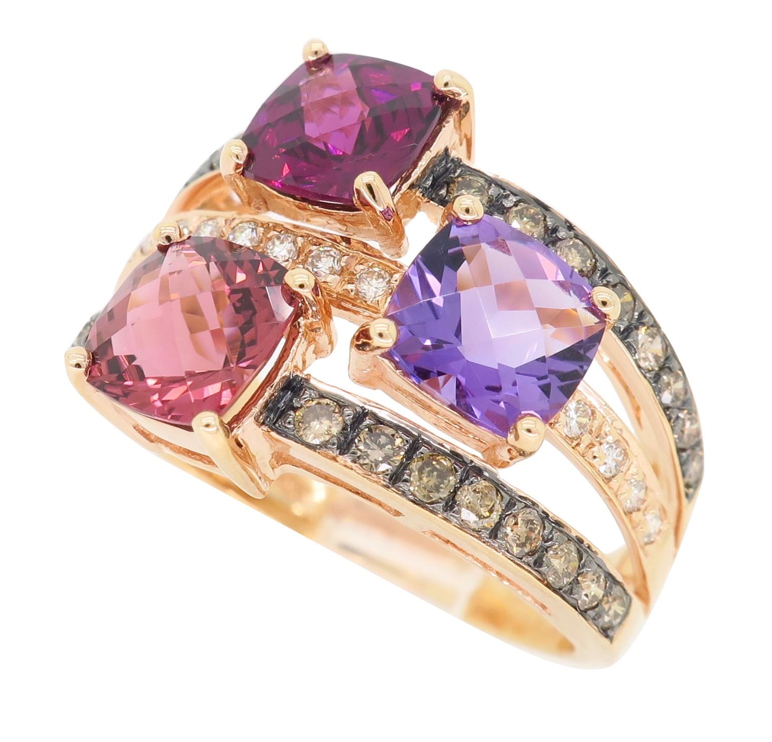 One Levian 14KT Rose Gold Colored Stones and Diamond Ring. One Cushion Shaped Rhodolite, Cushion Shaped Tourmaline and Cushion Shaped Amethyst stone. (14) Round Diamonds with a color of H-I and clarity of SI-2 and (26) chocolate Diamonds with a clarity of SI-2 with a total Diamond weight of 0.45cts. Total weight of this ring is 5.6 grams. Ring size is 7.