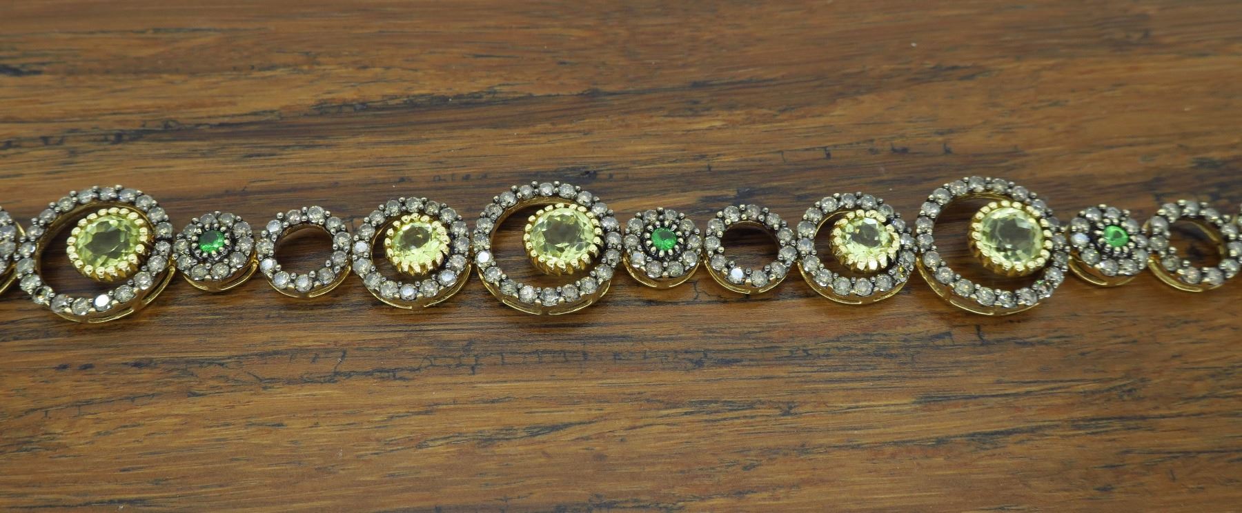 One Levian 14KT Yellow Gold 4.00ctw Diamond Bracelet. (284) Round Diamonds with a total weight of 4.00cts with a color of light chocolate and clarity of SI-1 to SI-2. (5) Tsavorite stones measuring 2mm each. (10) Citrine stones measuring 5.5mm. Total weight of this bracelet is 14.4 grams. Total length of this bracelet is 7 inches.