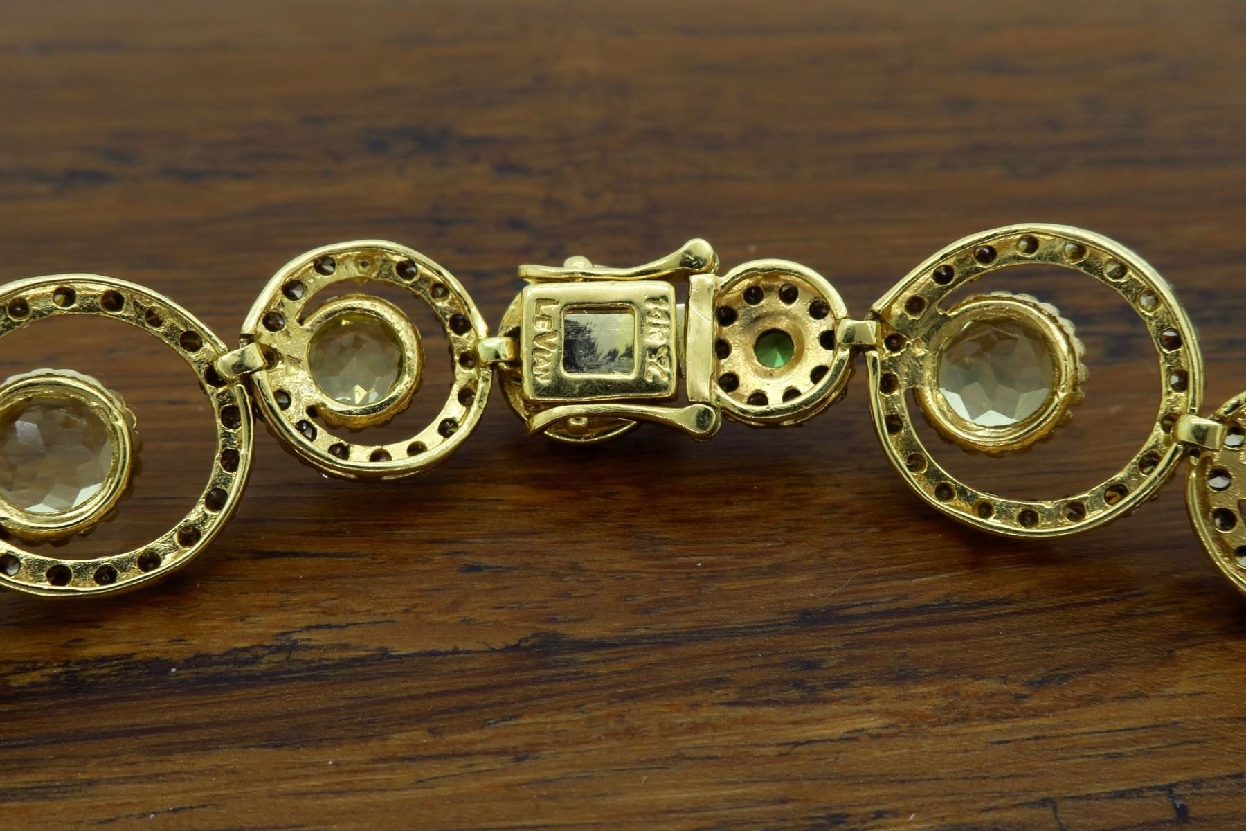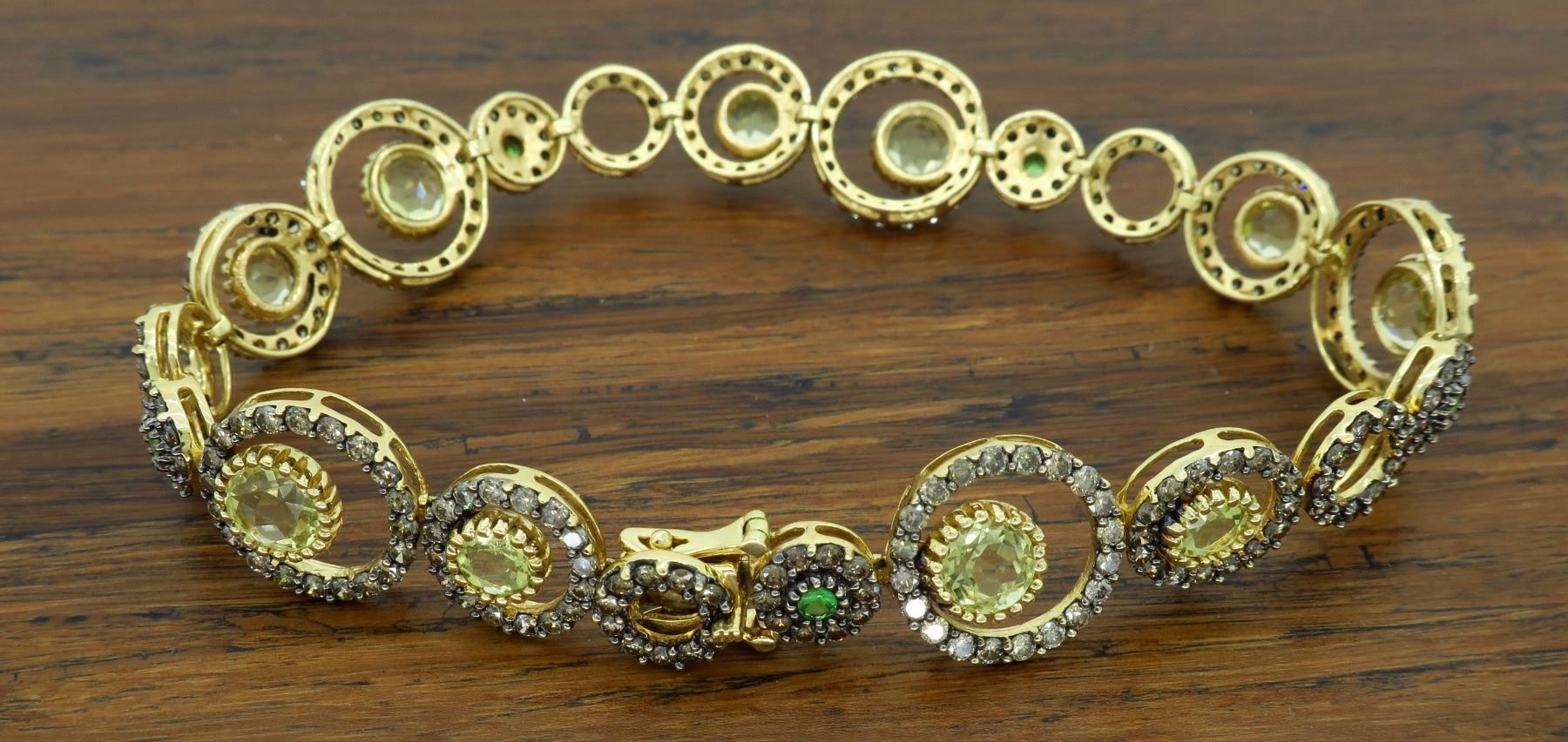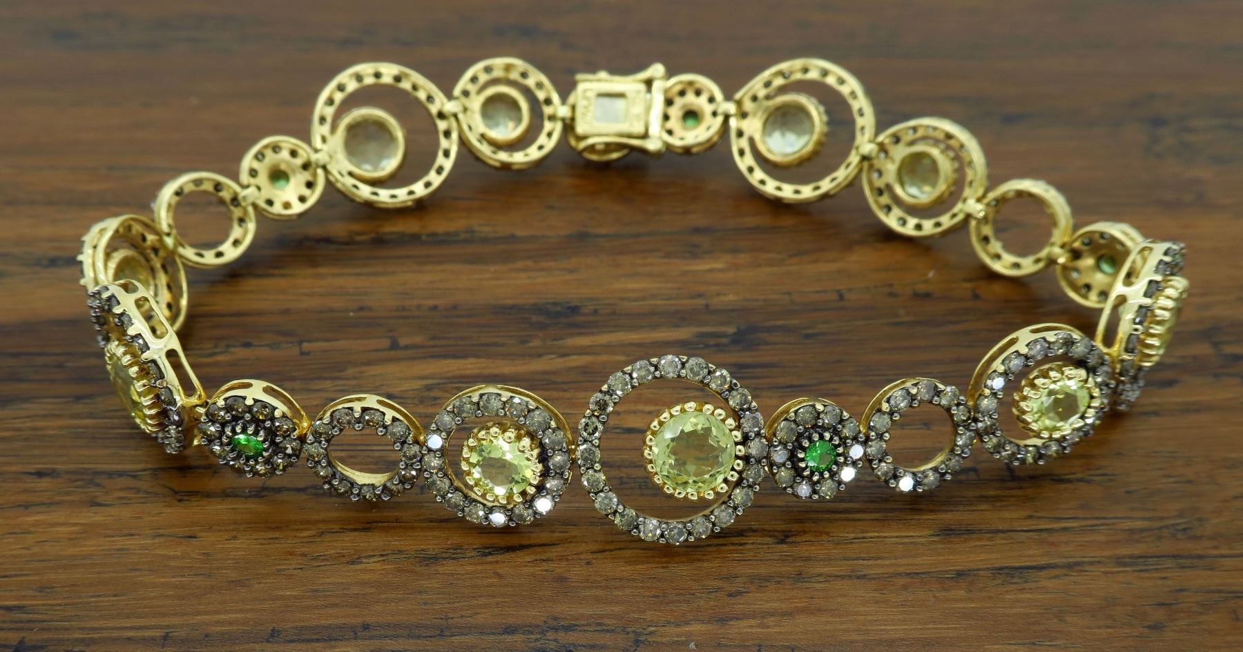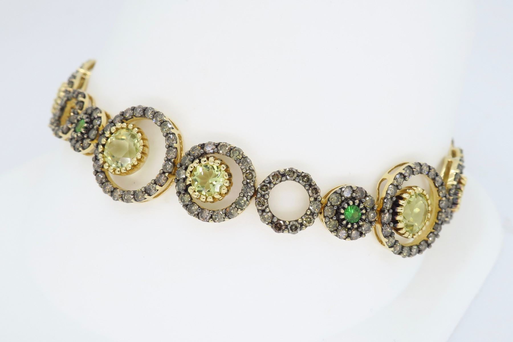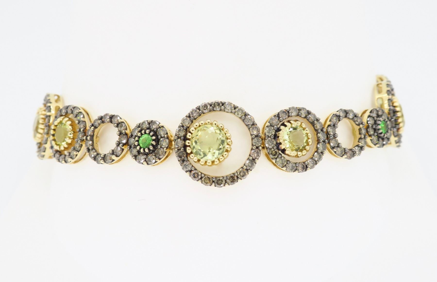 One Levian 14KT Yellow Gold 4.00ctw Diamond Bracelet. (284) Round Diamonds with a total weight of 4.00cts with a color of light chocolate and clarity of SI-1 to SI-2. (5) Tsavorite stones measuring 2mm each. (10) Citrine stones measuring 5.5mm. Total weight of this bracelet is 14.4 grams. Total length of this bracelet is 7 inches.