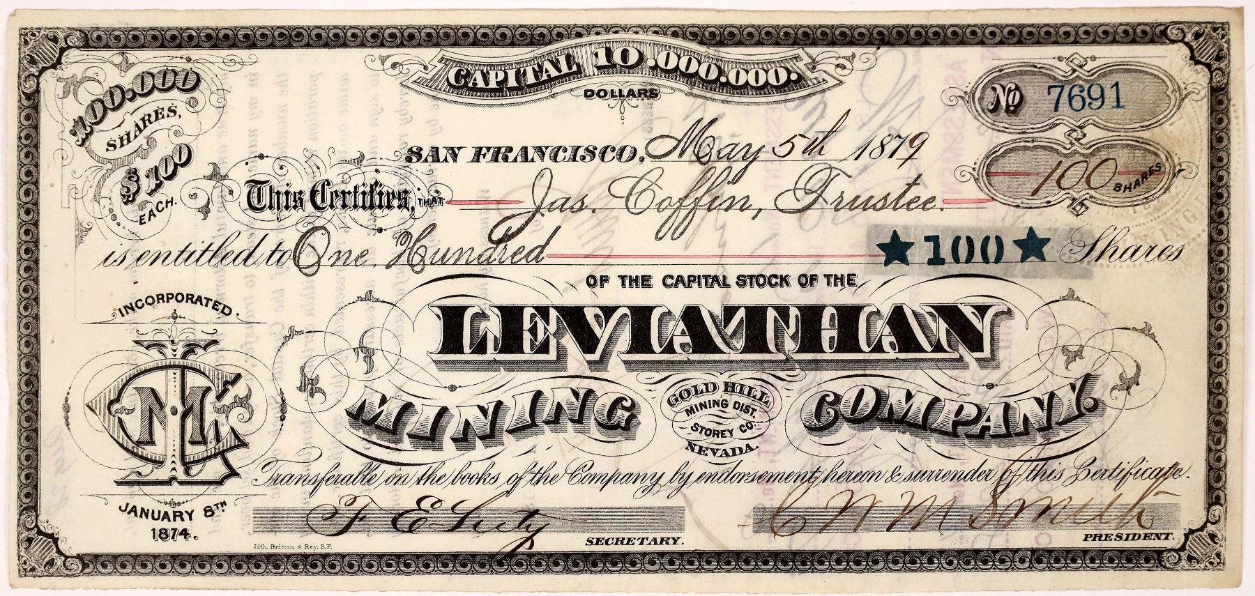 Leviathan Mining Company Gold Hill Mining District, Storey County, NV - Incorporated January 8, 1874. Cert# 7691 issued to Jas. Coffin, Trustee on May 5, 1879, for 100 shares. Signed by Secretary F. E. Luty and President C W M Smith. Company was recapitalized (Original May 15, 1873) at $10,00,000; 100,000 shares at $100. 2000 feet. This mine was located May 19, 1863, on what was known as the East Ledge lying about 1000 feet in front and parallel to the main Comstock Lode, opposite the Crown Point and Belcher mines. The mine reached a depth of 750 feet by 1878. (p. 213 Pacific Coast Mining Review 1878-79). A mining boom with the Big Bonanza prompted many mining properties to seek financing and refinancing. Printers Britton & Rey, S.F., 9 x 4.25" Gold Hill Nevada