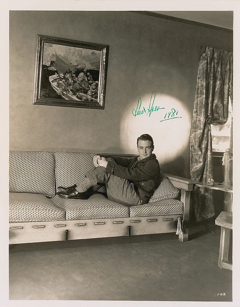 Glossy 8 x 10 photo of Ayres sitting on his couch, signed in green ink, “Lew Ayres, 1981.” Reverse bears an Otto Dyar photographer’s stamp. In fine condition.