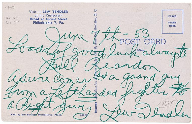 Hall of Fame boxer (1898-1970). Ballpoint signature and lengthy inscription, “Loads of good luck always to Bill Reardon a sure comer and a grand guy from a lefthanded fighter to a right guy. Lew Tendler” adding “June 7th-53”on an off-white 5.5 x 3.5 postcard from Tendler’s Philadelphia restaurant. A bit of light soiling, corner bumps, and two pencil notations, otherwise fine condition.