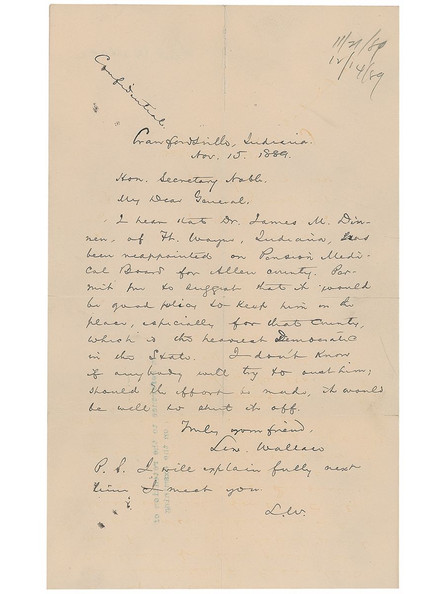 Union general (1827–1905) who became better known as the author of the best-selling religio-historical novel Ben-Hur. ALS, one page, 6.5 x 11, November 15, 1889. Letter, marked “Private,” to Secretary of the Interior, John Willock Noble. In full: “I hear that Dr. James M. Dinnen, of Ft. Wayne, Indiana, has been reappointed on Pension Medical Board for Allen county. Permit me to suggest that it wold be good policy to keep him in the place, especially for that county, which is the heaviest Democratic in the State. I don't know if anybody will try to oust him; should the effort be made, it would be well to shut it off." Cryptically, Wallace adds in a postscript, "I will explain fully next time I meet you. L.W." Partial separations along intersecting folds, two pencil notations to top right, and some ink transfer from another letter to lower portion, otherwise fine condition.