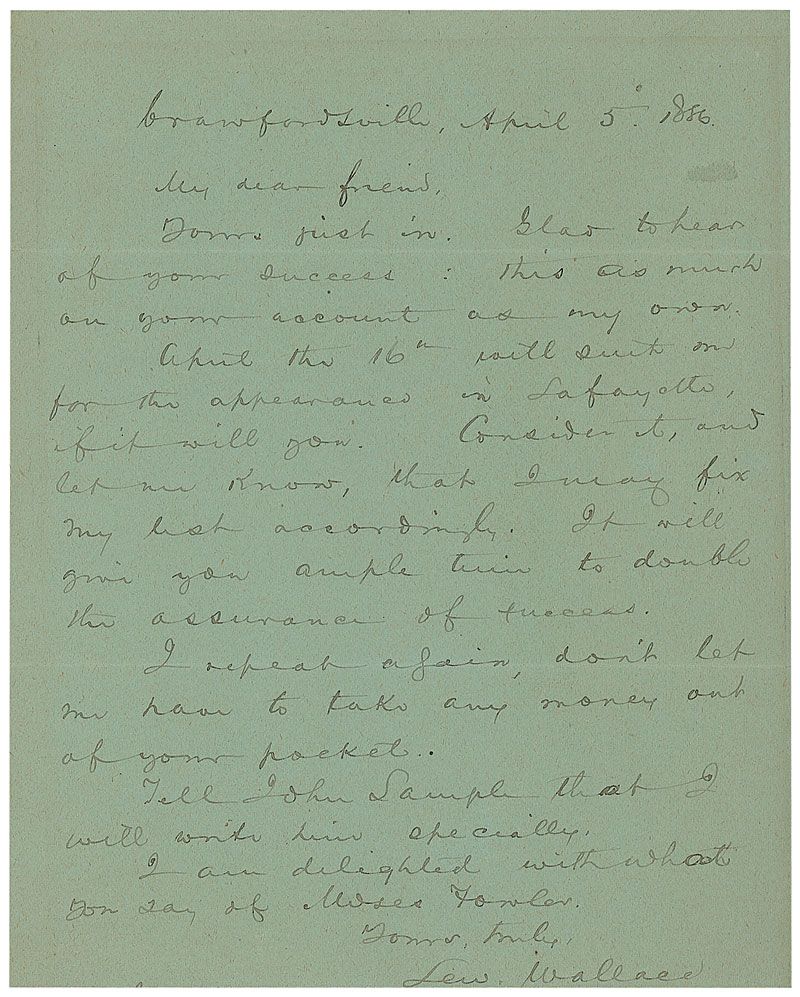 ALS, one page, 6 x 7.5, April 5, 1886. Letter to an unidentified recipient. In full: “Yours just in. Glad to hear of your success. This as much on your account as my own. April the 16th will suit me for the appearance in Lafayette, if it will you. Consider it, and let me know, that I may fix my list accordingly. It will give you ample time to double the assurance of success. I repeat again, don’t let me have to take any money out of your pocket. Tell John Sample that I will write him specially. I am delighted with what you say of Moses Fowler.” In fine condition, with some light toning to edges from previous display.