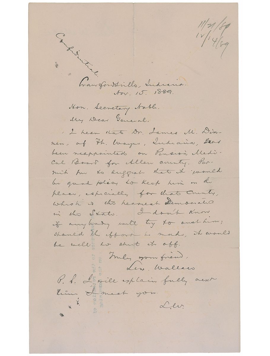 Union general (1827–1905) who became better known as the author of the best-selling novel Ben-Hur. ALS, one page, 6.5 x 11, November 15, 1889. Letter to Secretary of the Interior John Willock Noble. In full: “I hear that Dr. James M. Dinnen, of Ft. Wayne, Indiana, has been reappointed on Pension Medical Board for Allen county. Permit me to suggest that it would be good policy to keep him in the place, especially for that county, which is the heaviest Democratic in the State. I don't know if anybody will try to oust him; should the effort be made, it would be well to shut it off." Cryptically, Wallace adds in a postscript, "I will explain fully next time I meet you. L. W." In very good condition, with partial separations along intersecting folds and some ink transfer from a typed letter to lower portion.