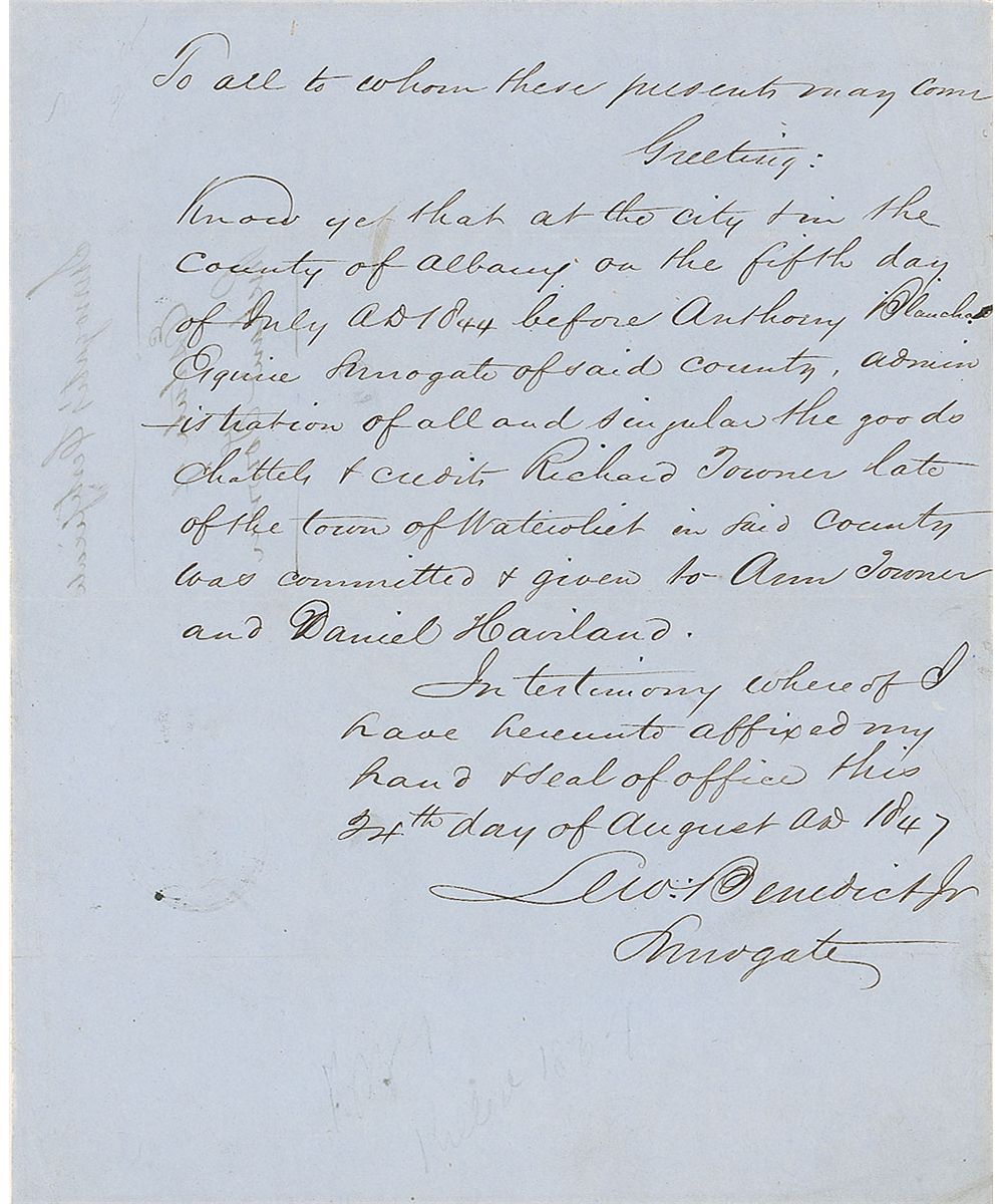 Union officer (1817–1864) imprisoned at the notorious Libby Prison, and later killed in action during the Red River campaign. DS, signed “Lewis Benedict, Jr, Surrogate,” one page, 7.5 x 9.5, August 24, 1847. An interesting legal document advising, “Before Anthony Blanchard Esquire Surrogate of said county, administration of all and singular the goods chattels & credits [of] Richard Towner…was committed & given to Ann Towner and Daniel Harland.” Page is inlaid to a slightly larger sheet. A couple slight brushes to text, a few creases, and mild show-through from docketing on reverse, otherwise fine condition.