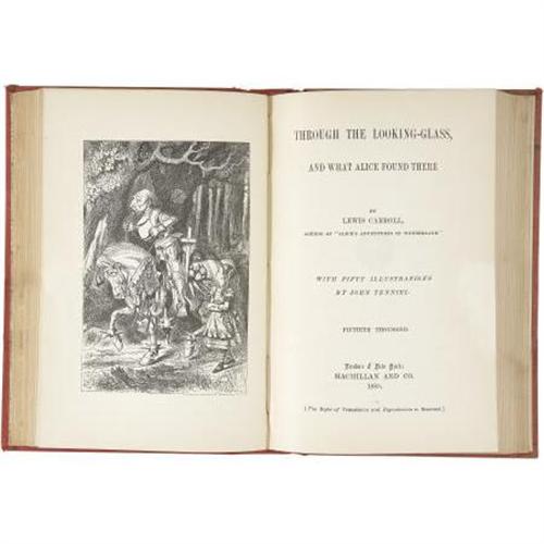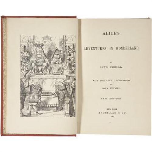 <B>Lewis Carroll. </B></I><B><I>Alice's Adventures in Wonderland, and Through the Looking Glass</B></I></B></I><B>. </B></I>New York: Macmillan and Co., 1885.<BR> <BR>Combined edition with both stories in one volume. Twelvemo. 192 pages; 224 pages; 22 page publisher's catalog in back. Ninety-two illustrations by John Tenniel in text. <BR><BR>Original red cloth with gold Cheshire cat vignette stamped in gold on the front board; Queen of Hearts vignette stamped in blind on the rear board; titles stamped in gilt on the spine. Floral endpapers. Spine faded and soiled, corners bumped and slightly fade at the edges. Head and foot of spine frayed. Shelf wear. Contents slightly toned. Old gift inscription of the second front free endpaper. About very good.<BR><BR><BR><b>Shipping:</b> Books & Catalogs (<a target="_blank" href="http://www.heritageauctions.com/common/shipping.php">view shipping information</a>)