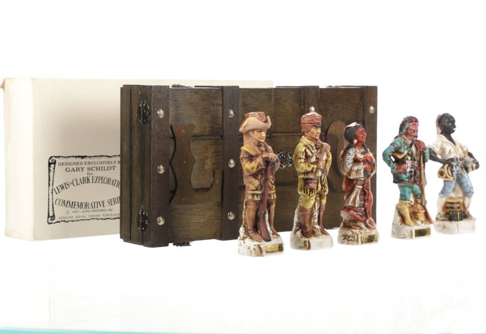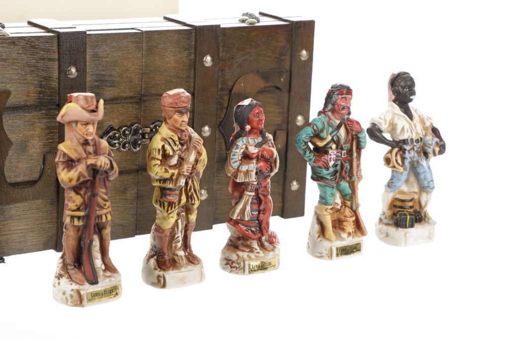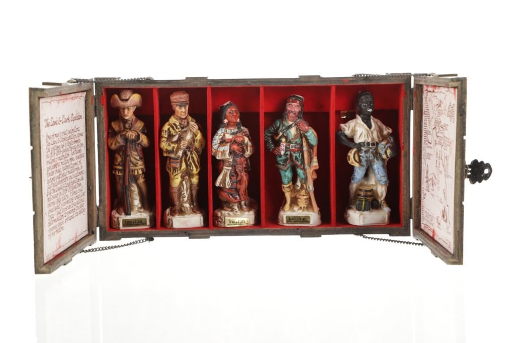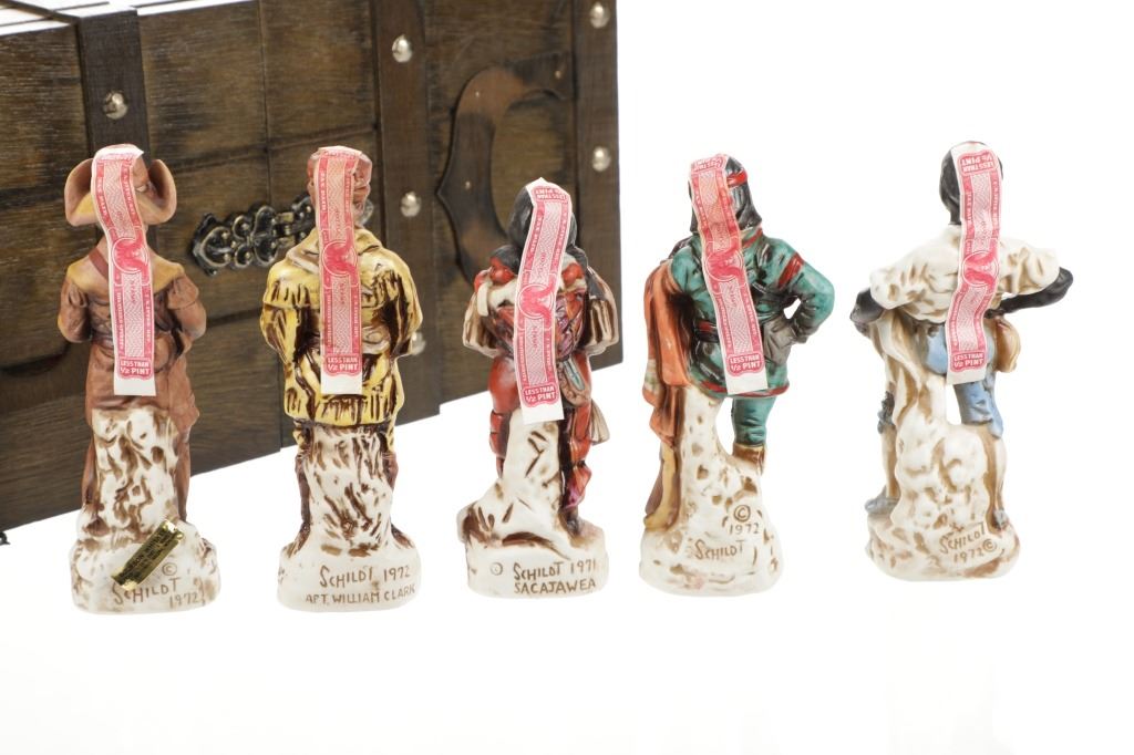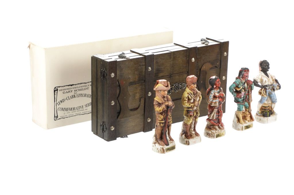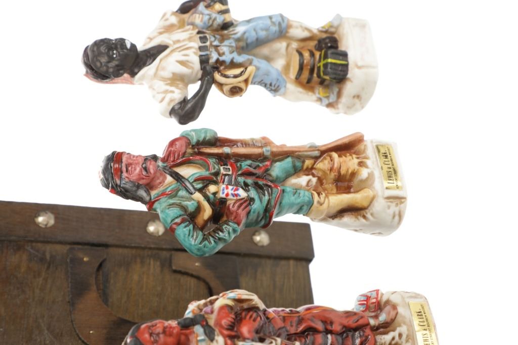 This lot features 5 porcelain decanters depicting notable members of the Lewis & Clark exploration: Captain Meriweather Lewis, Second Lieutenant William Clark, Toussaint Charbonneau and his Shoshone wife, Sacagawea, and an enslaved African American, York. The bottom of each figure reads "Designed exclusively by Gary Schildt for Lewis-Clark Exploration Commemorative Series 1972 Alpha Industries Inc. Genuine Royal Crown Porcelain".