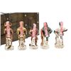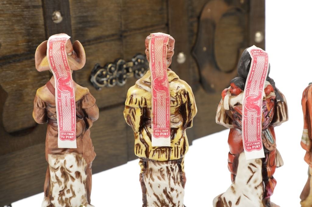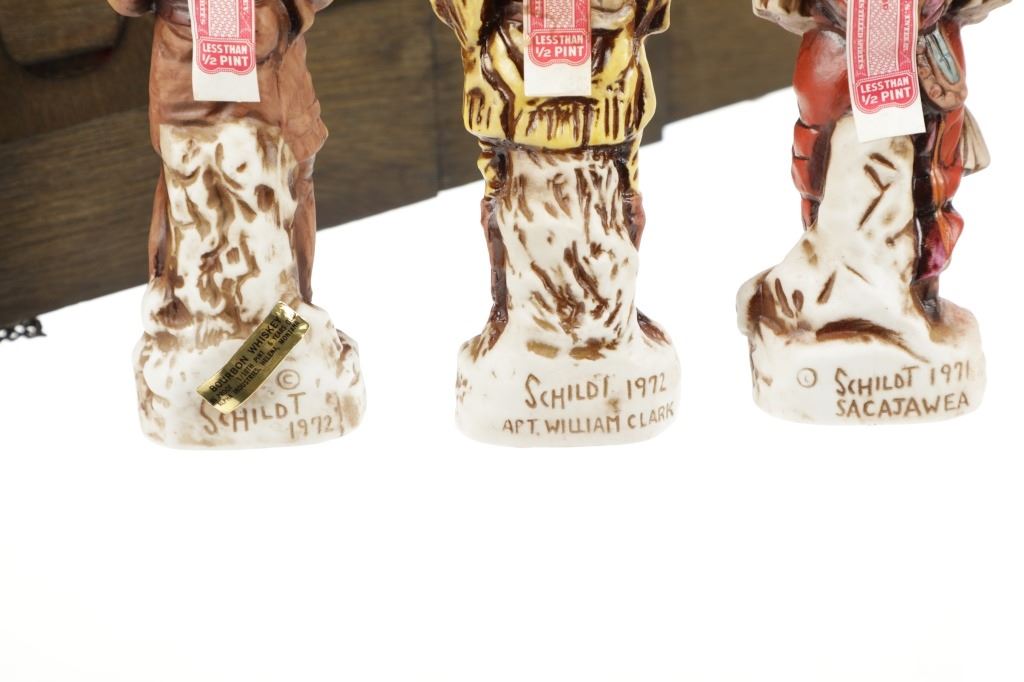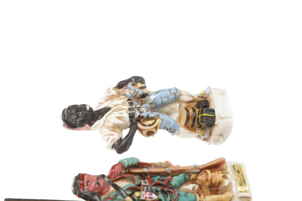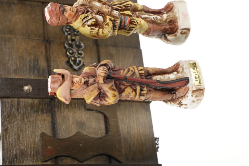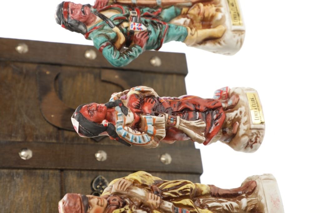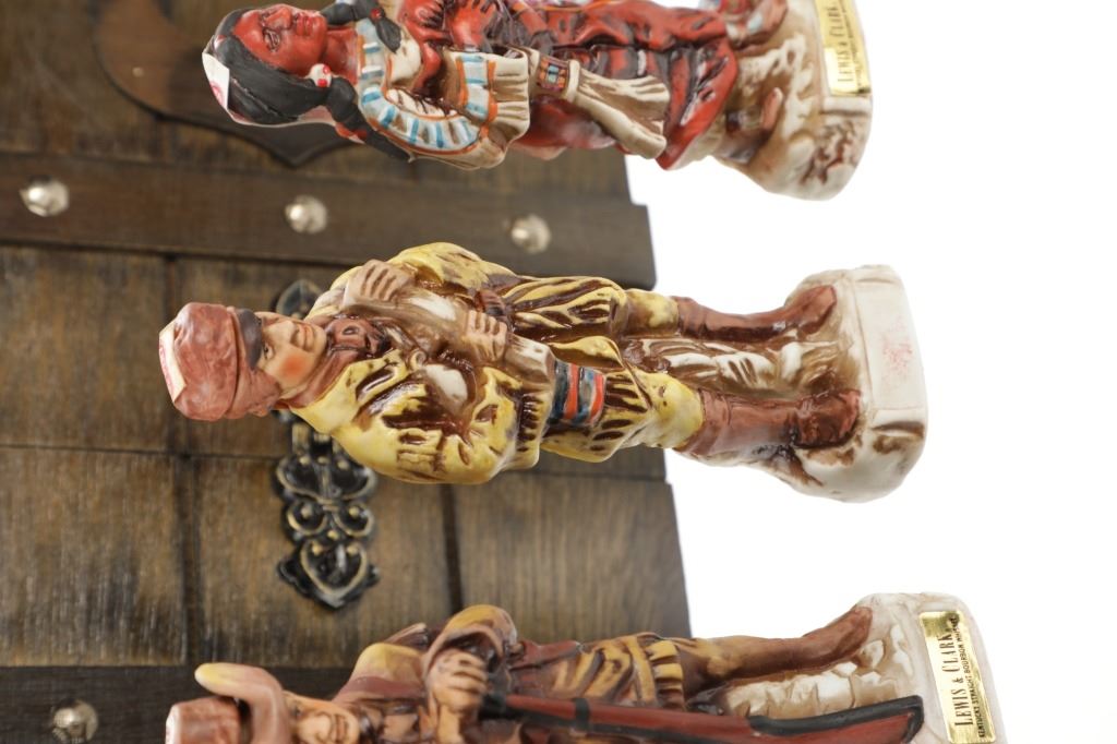 This lot features 5 porcelain decanters depicting notable members of the Lewis & Clark exploration: Captain Meriweather Lewis, Second Lieutenant William Clark, Toussaint Charbonneau and his Shoshone wife, Sacagawea, and an enslaved African American, York. The bottom of each figure reads "Designed exclusively by Gary Schildt for Lewis-Clark Exploration Commemorative Series 1972 Alpha Industries Inc. Genuine Royal Crown Porcelain".
