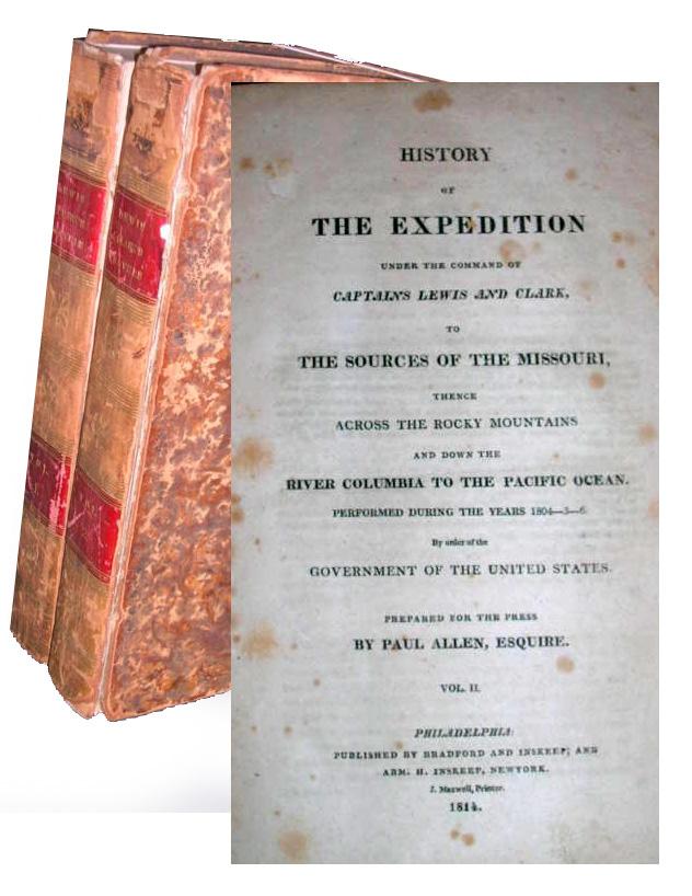 First edition two-volume set of ''History of the Expedition under the Command of Captain Lewis and Clark to the source of the Missouri thence across the Rocky Mountains and down the river Columbia to the Pacific Ocean performed during the years 1805-05-06 by Meriwether Lewis and William Clark''. Published by Bradford and Inskeep: New York: 1814. Regarded as the definitive account of the first exhaustive, and most important Western exploration of America, which covered some eight thousand miles in slightly more than twenty-eight months. Lewis and Clark brought back the first reliable information about much of the area they traversed, made contact with the Indians as a prelude to the expansion of the fur trade, and advanced the geographical knowledge of the continent. This official account of the expedition is as much a landmark in Americana as the trip itself. Books, each measuring 7.75'' x 9.75'', are bound in original marble-patterned leather boards with intact endpapers and contain five engraved maps, missing the fold-out map present in some copies. Rebacked with original spines laid down. Overall in very good condition with faint dampstaining throughout. A very attractive set of America's most important exploration narrative.