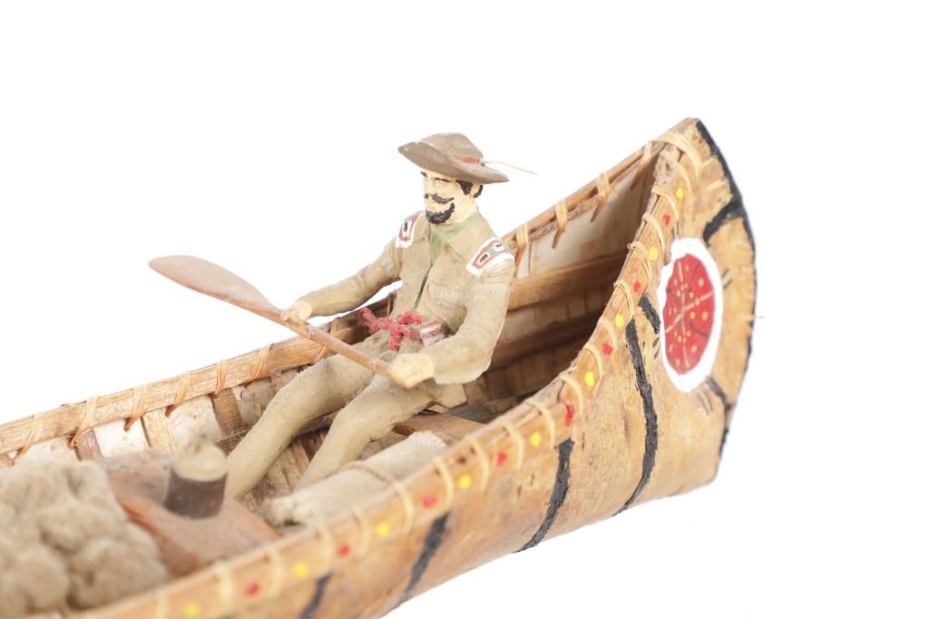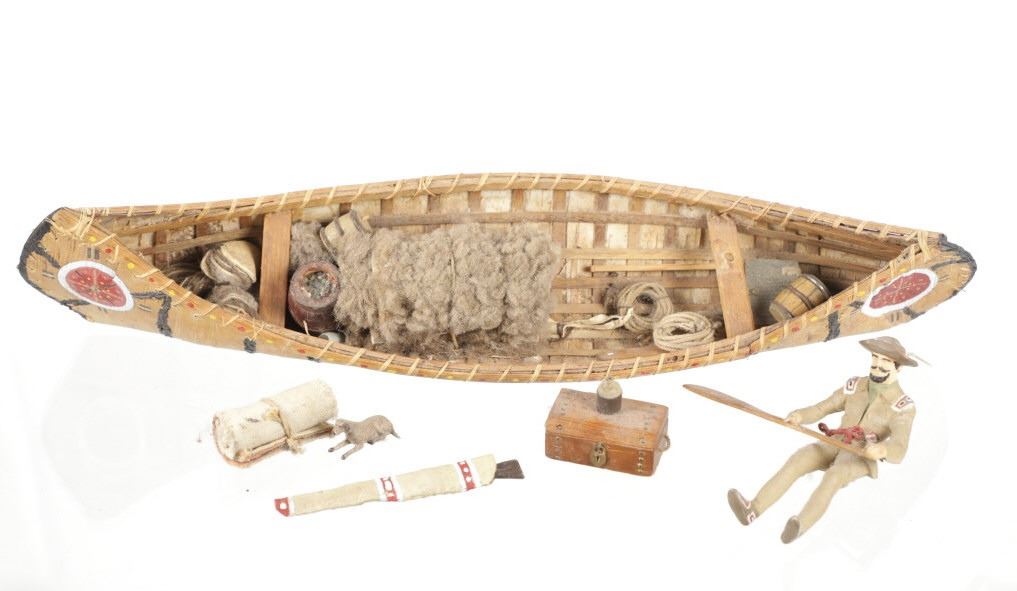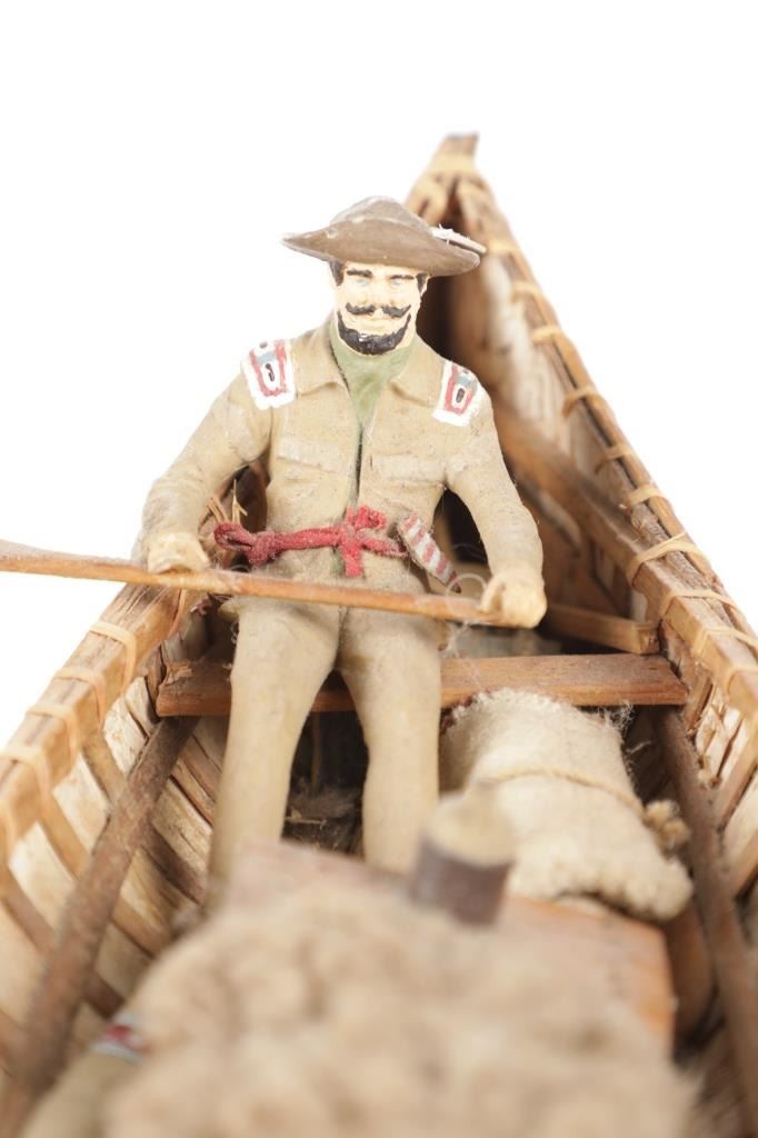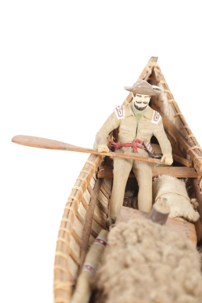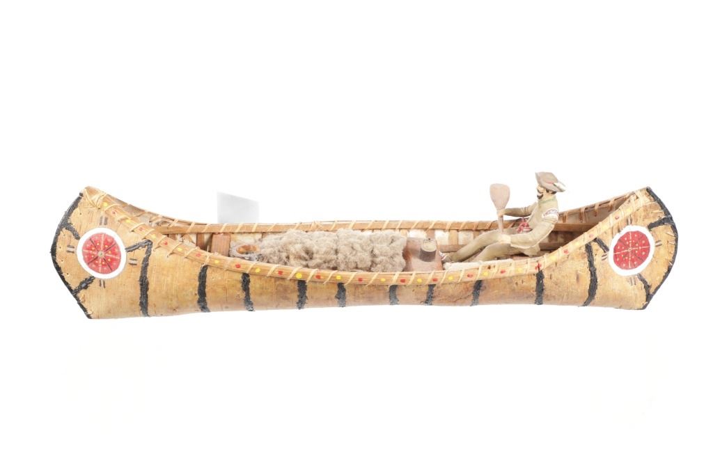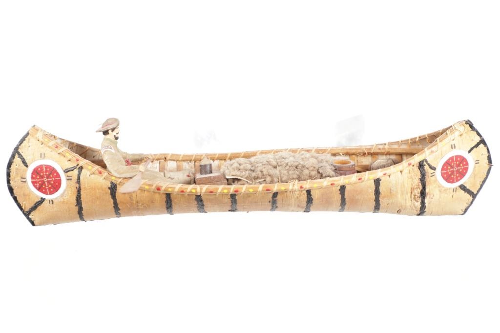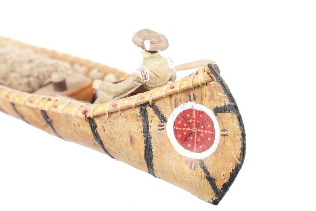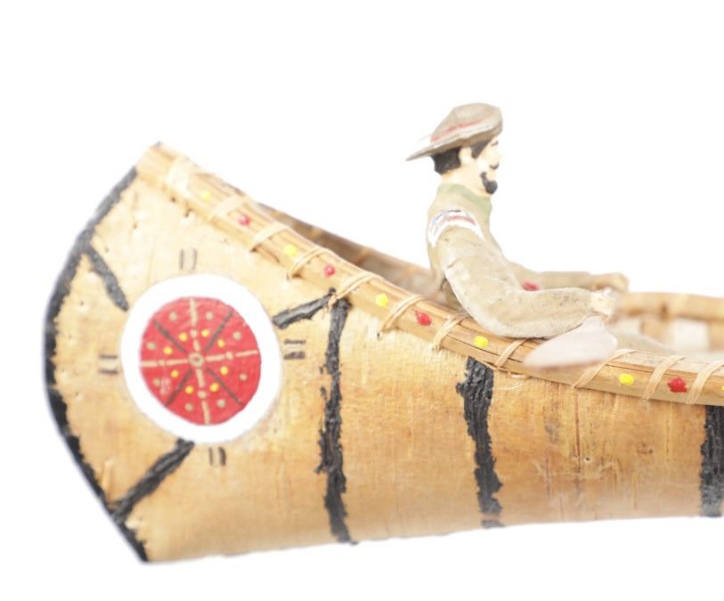Featured in this lot is a Lewis and Clark life-like birch wood canoe display, circa 1960s. The display is wonderfully and professionally crafted birch wood and wool construction. The figural display shows a Lewis and Clark expedition purveyor rowing a canoe with Native marking on the outside of the hull and shows all of his supplies in the inside of the canoe with great attention to detail to the garments he is wearing and the supplies he is rowing including a bed roll, provisions, a rifle in a hide scabbard, and various supplies in the very front of the canoe. The coloration to the outside of the hull of the canoe are red, yellow, green, white, and black. The condition of this of this Lewis and Clark canoe display is fair with one small break in the birch canoe in the front of the canoe but otherwise shows fair overall condition. The measurements of this canoe figural are 3 3/4" x 6" x 17". The collective weight of this canoe figural is 8oz.*
