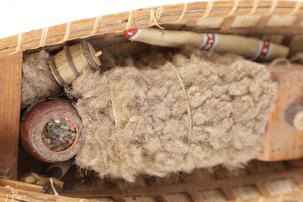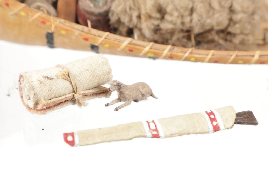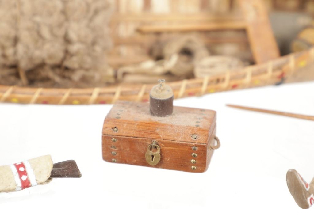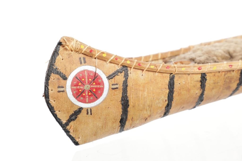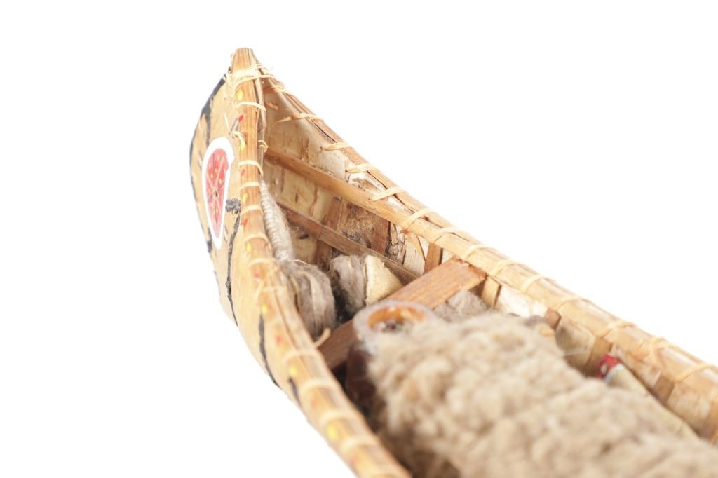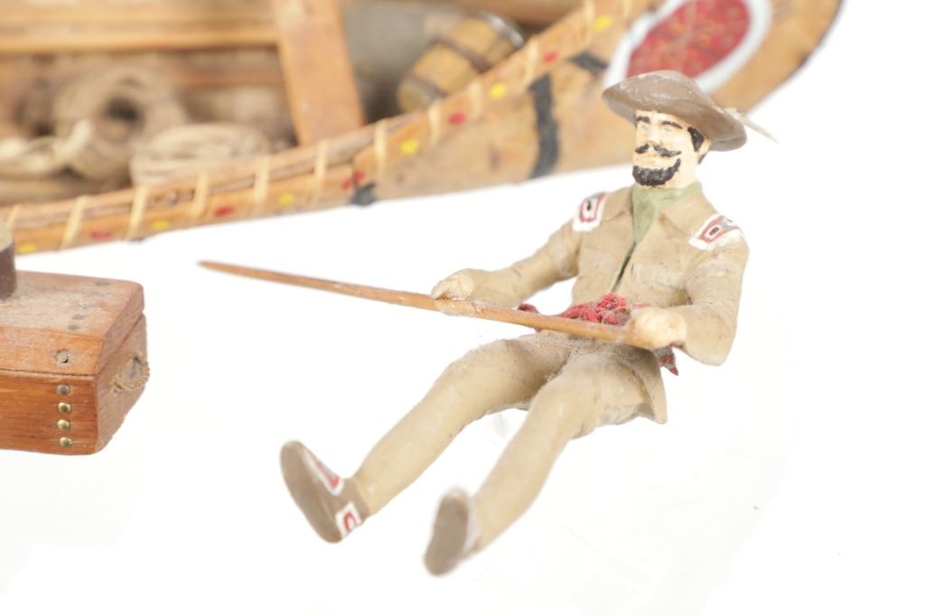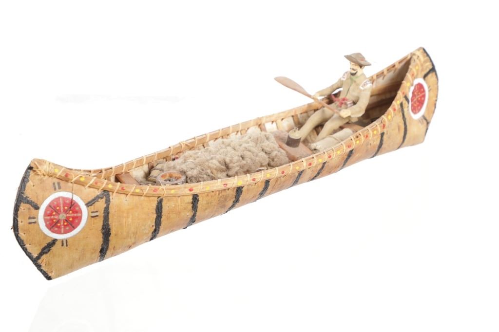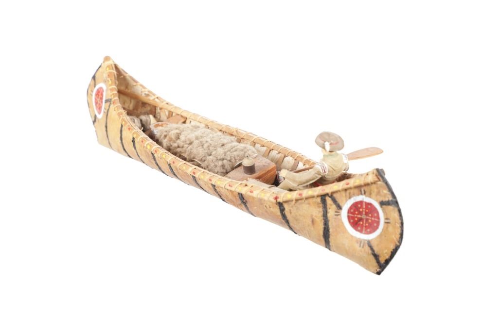 Featured in this lot is a Lewis and Clark life-like birch wood canoe display, circa 1960s. The display is wonderfully and professionally crafted birch wood and wool construction. The figural display shows a Lewis and Clark expedition purveyor rowing a canoe with Native marking on the outside of the hull and shows all of his supplies in the inside of the canoe with great attention to detail to the garments he is wearing and the supplies he is rowing including a bed roll, provisions, a rifle in a hide scabbard, and various supplies in the very front of the canoe. The coloration to the outside of the hull of the canoe are red, yellow, green, white, and black. The condition of this of this Lewis and Clark canoe display is fair with one small break in the birch canoe in the front of the canoe but otherwise shows fair overall condition. The measurements of this canoe figural are 3 3/4" x 6" x 17". The collective weight of this canoe figural is 8oz.*
