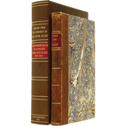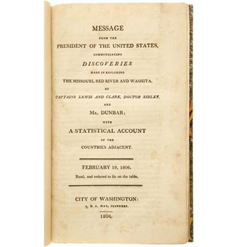 <B>Merriwether Lewis, William Clark and Thomas Jefferson: </B></I><B><I>Message from the President of the United States, Communicating Discoveries Made in Exploring the Missouri, Red River and Washita, by Captains Lewis and Clark,</B></I></B></I> <I>Doctor Sibley, and Mr. Dunbar; with a Statistical account of the Countries Adjacent. February 19, 1806. Read, and ordered to lie on the table. </B></I>(City of Washington: A. & G. Way, Printers, 1806). First edition, there is no indication if this is the house or Senate issue. Howes suggest this is earlier than the Senate issue. Octavo (8" x 5"). 171 pages plus 7 pages Meteorological Observations. With the large folding map titled: <I>Map of the Washita River in Louisiana</B></I> (33" x 8"), and with two folding charts. Quarter calf back over marbled boards, with a red morocco spine lettering label. Lightly rubbed around edges, sheets a bit foxed and browned, bookplate. A handsome, near fine copy. Housed in a custom full green morocco clamshell case, lettered in gilt on the spine.<BR>"Jefferson's <I>Message</B></I>, read in Congress on February 19, 1806, became the first separate publication of information from the Lewis and Clark Expedition. It prints a long letter from Lewis and a detailed table providing data about each Indian nation that Lewis and Clark had met or learned about. Other reports were also included from John Sibley (1757-1837), a physician who had settled in Natchitoches, Louisiana, and began sending geographical information to officials in Washington about 1803, and William Dunbar (1749-1810), a Scottish-born scientist who emigrated to America in 1771 and settled in Mississippi; he was commissioned by Jefferson to explore the Ouachita (Washita) and Red River valleys. The original edition of Jefferson's <I>Message</B></I> and companion reports was published in Washington, D.C. in a quantity of only one-thousand copies. These were rapidly consumed..." -American Journeys.<BR>Streeter notes that "Two letters by Dr. Sibley, one on the Indian tribes of Texas and the other an account of the Red River and the adjacent country, seem to be the first accounts of Texas in book form." The extremely rare large map by Nicholas King is of the lower trans-Mississippi, taken from Dunbar's survey. The Sibley-Dunbar descriptions of the Texas-Louisiana frontier gave the first formal and satisfactory picture of the southern portion of the Louisiana Purchase. <I>From the collection of Darrel Brown.</B></I><BR><BR><B>Reference: </B></I>Streeter 1038: "with exceedingly rare map. Only seven copies with map known."<BR><BR><b>Shipping:</b> Books & Catalogs (<a target="_blank" href="http://www.heritageauctions.com/common/shipping.php">view shipping information</a>)