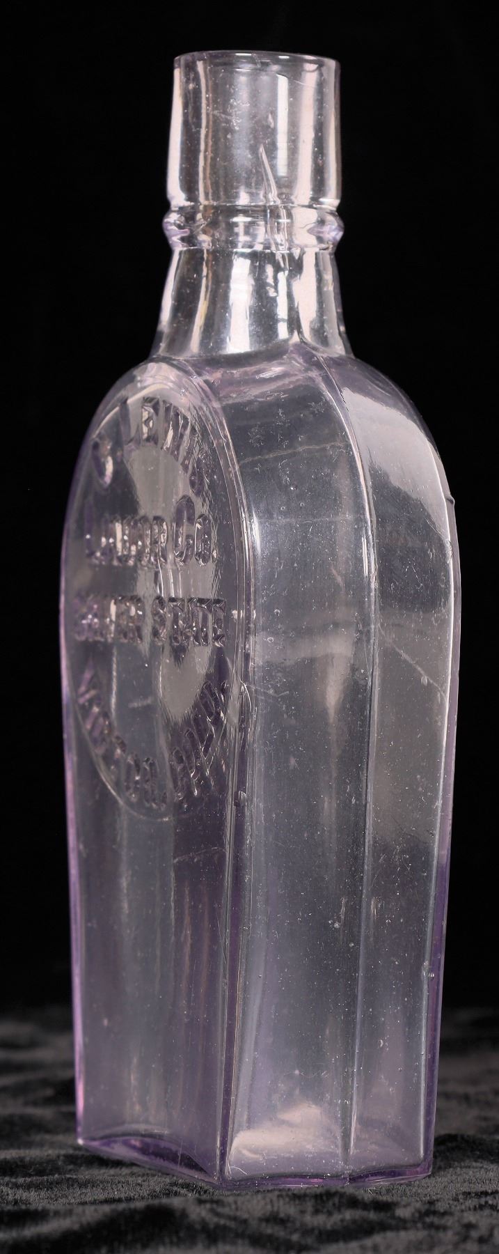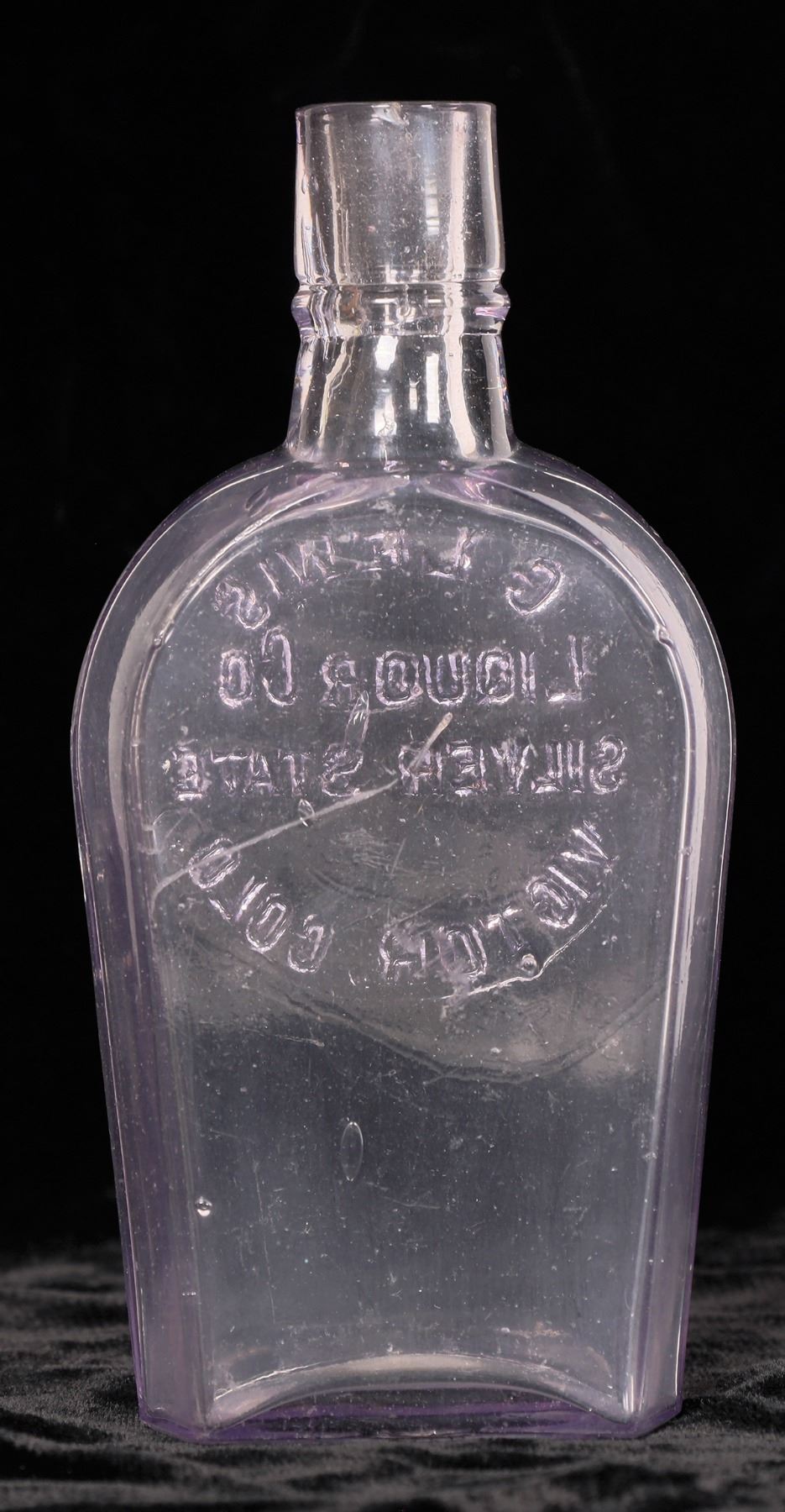 G. Lewis / Liquor Co. / Silver State / Victor, colo. half pint coffin flask. With knife edge. Appears problem free except polished scratch on back. W142 in Prebble 1894. Ron Reed collection