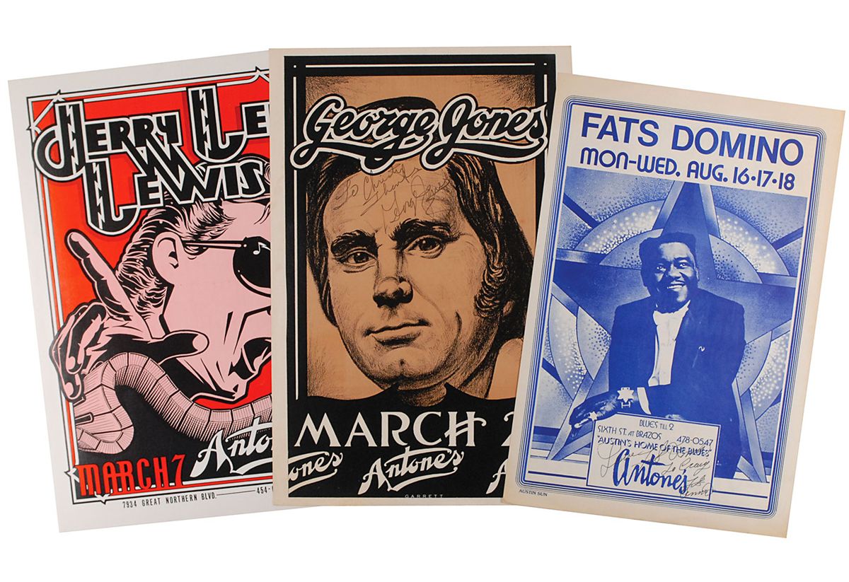 Three original posters (two signed) for performances by legendary musicians at Antone’s Nightclub in Austin, Texas, each measuring approximately 11 x 17, some dates unknown. Posters are for the following shows: George Jones, March 28, 1979, signed and inscribed in black felt tip, “To Christopher, Thanks, George Jones”; Fats Domino, August 16–18, signed and inscribed in black ink, “Love, Fats Domino. To Craig, Fats Domino”; and Jerry Lee Lewis, March 7, 1980. In overall fine condition. Originate from the personal collection of Clifford Antone, founder of the club.
