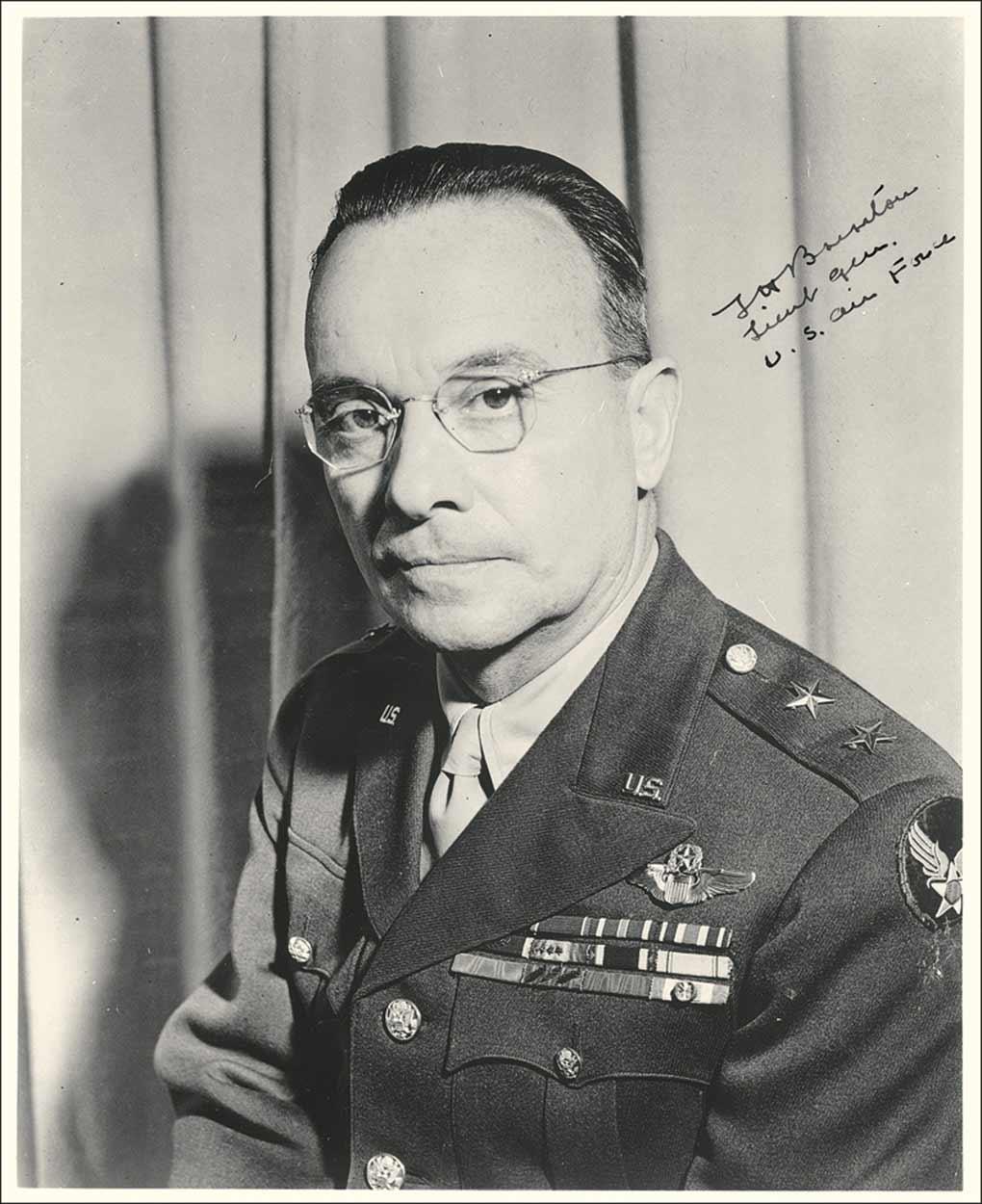 Military aviation pioneer and United States Army Air Forces general in World War II (1890-1967). Vintage glossy 8 x 10 photo, signed in fountain pen, “L. H. Brereton, Lieut. Gen. U. S. Air Force.” In good condition, with moderate overall creasing and surface dings.