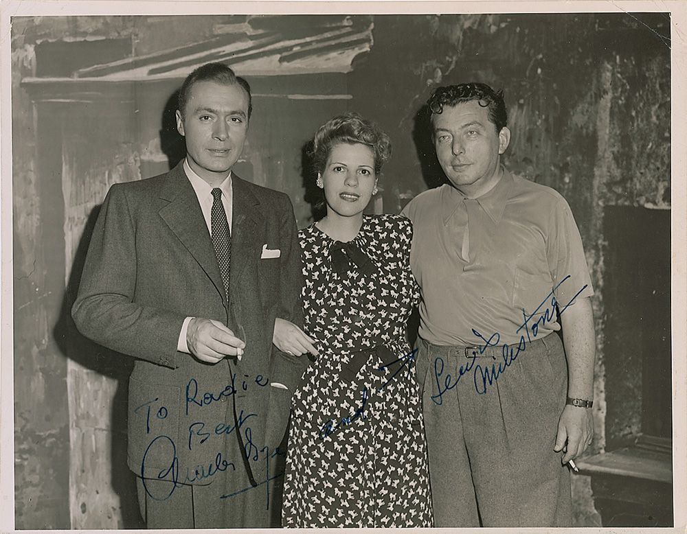 Oscar-winning, Ukrainian-born American film director Lewis Milestone (1895–1980) helmed such classics as All Quiet on the Western Front, Of Mice and Men, and Ocean’s 11. Vintage glossy 10 x 7.75 photo of Milestone, Boyer, and journalist Radie Harris, signed and inscribed to Harris in fountain pen “To Radie, Best, Charles Boyer,” “and Lewis Milestone.” In very good condition, with scattered marks, creases, and impressions, heavier creasing to the corners, and a lightly trimmed bottom edge.