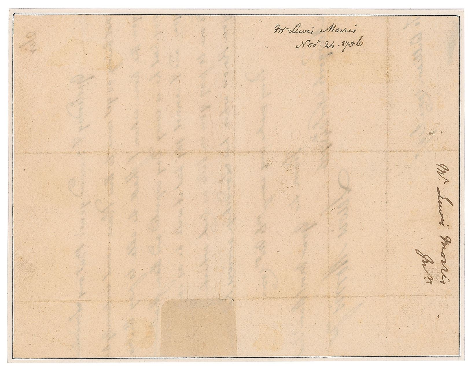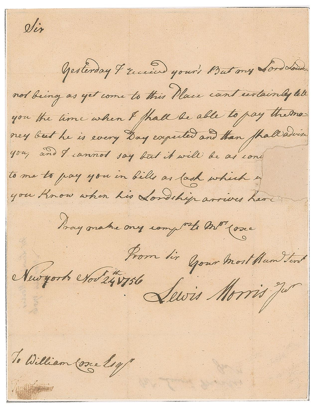 ALS signed “Lewis Morris Ju'r,” one page, 6.25 x 8.25, November 24, 1756. Letter to William Cosce, in part: "Yesterday I received yours But my Lord Lowe not being as yet come to this Place can't certainly tell you the time when I shall be able to pay the money but he is every Day expected and then shall advise you, and I cannot say but it will be as…to me to pay you in bills as cash which…you know when his Lordship arrives here." In fine condition, with a professional repair to paper loss at the right edge which affects several words of text.