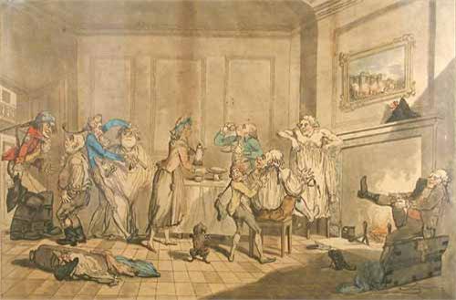 Lewis after Frederick George Byron set of 6 coloured aquatints, A Visit to a Convent near Amiens, Breakfast at Breteuil, Changing Horses near Clermont, Returning from a Review at the Champ de Mars, Coming out of a Country Theatre & Inn Yard at Calais, 1801, 15 x 23 ins. £700-1,000