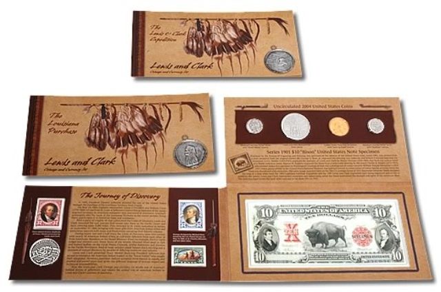This set is still sealed the way it arrived from the mint. It contains an uncirculated Lewis and Clark commemorative Silver Dollar Series 1901 $10 Bison Note Specimen and other