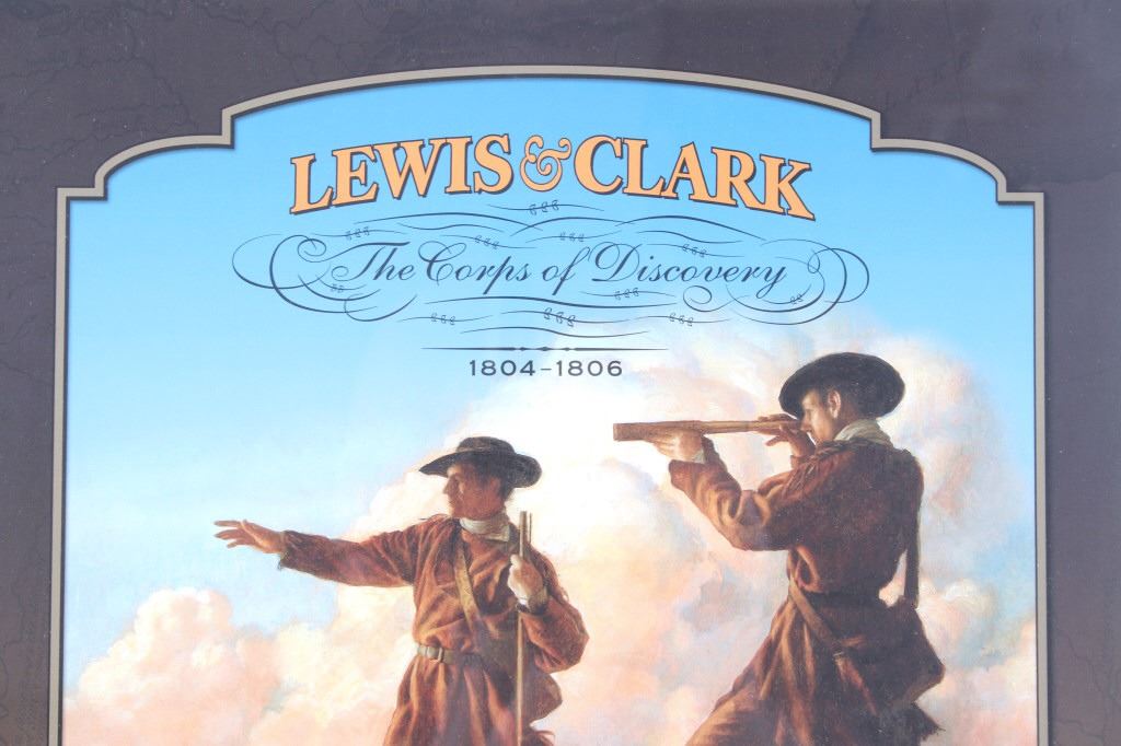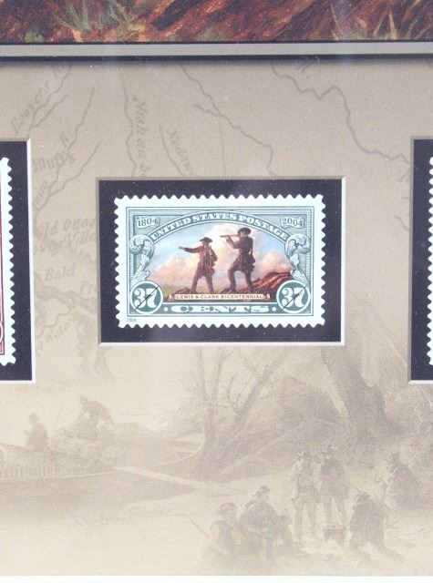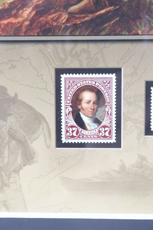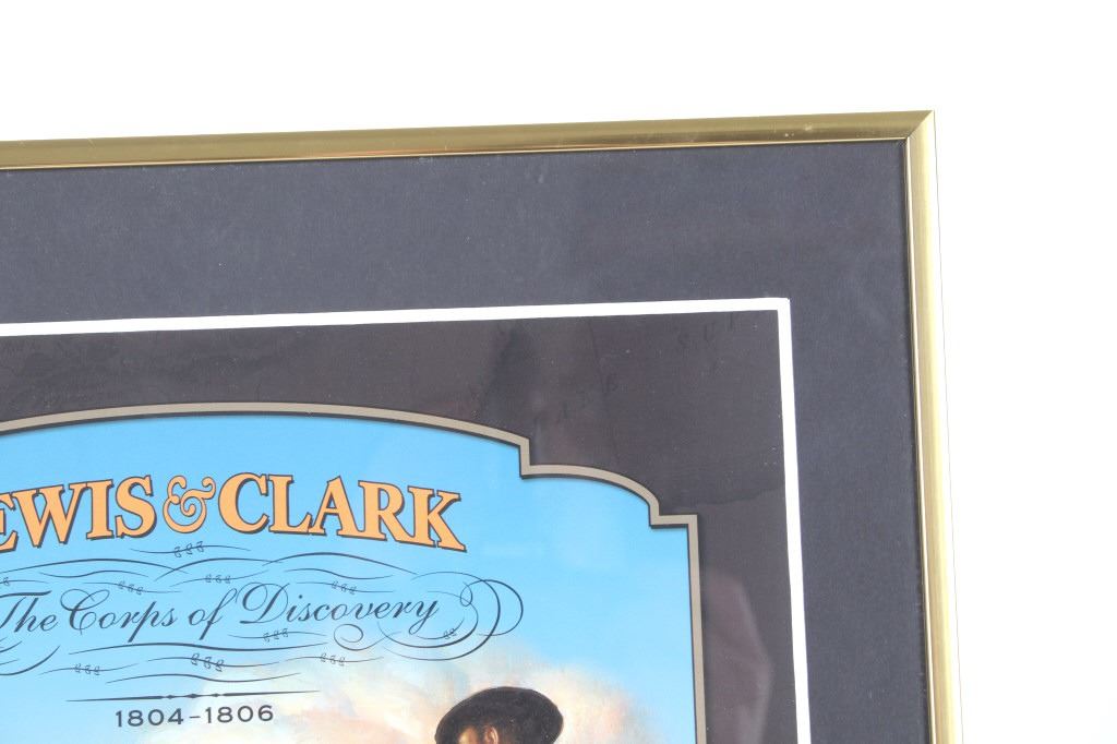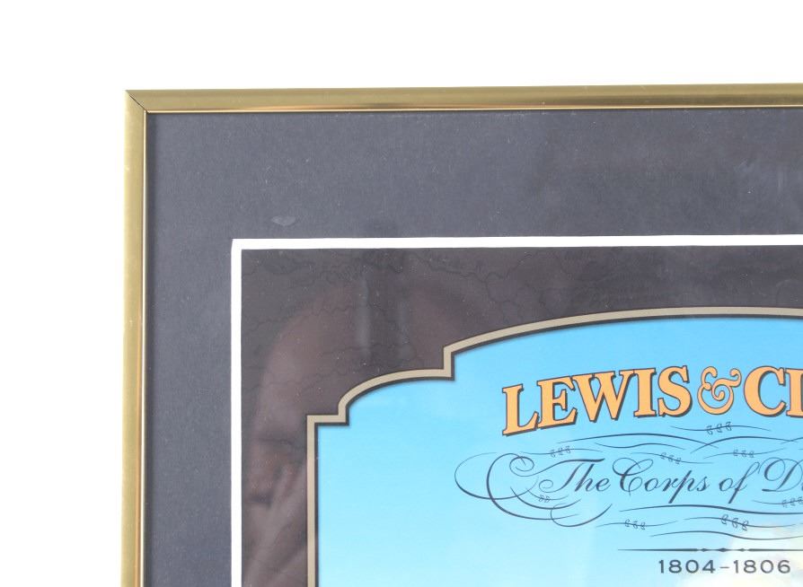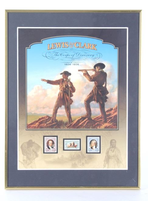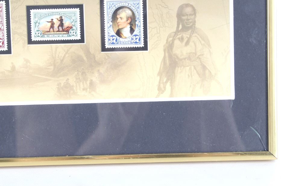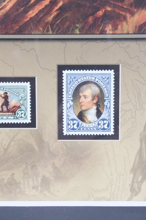 For your consideration is this Lewis and Clark: The Corps of Discovery framed art. This framed artwork features Lewis and Clark front and center as they look over the plains. One is holding a handheld telescope and the other pointing into the distance with his right hand and holding his rifle in his left. Above them in yellow lettering reads, "Lewis and Clark" and below that in black lettering reads, "The Corps of Discovery 1804-1806". Below the art are three of the USPS specialty stamps from 2004, honoring Lewis and Clark and their discoveries and adventures. One stamp features Lewis's face, the other Clark's face and the middle stamp shows the same art as shown above it. The background is of a map and features a drawing of Sacajawea, a camp scene and river scene, and a man holding his freshly hunted deer. The print is single matted and set in a metal frame behind glass. The print and frame show good condition, with only a slight crack in the bottom right of the glass. The print measures 13 1/4" L x 10 1/4" W. The entire piece measures 17" L x 13" W.