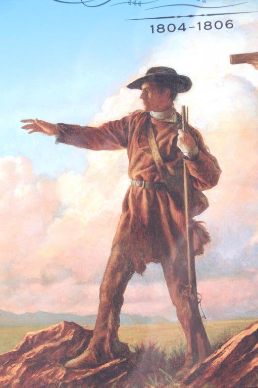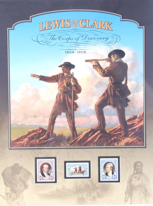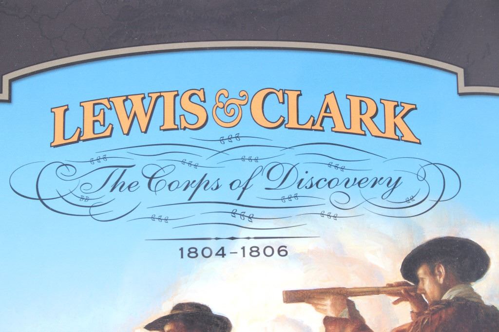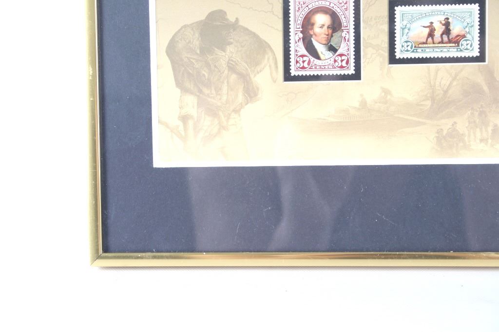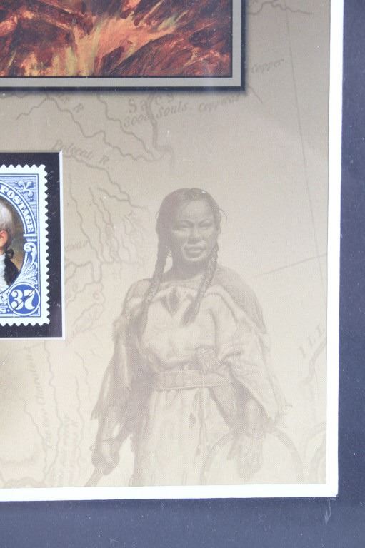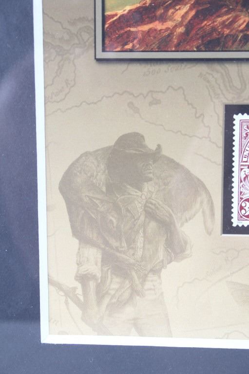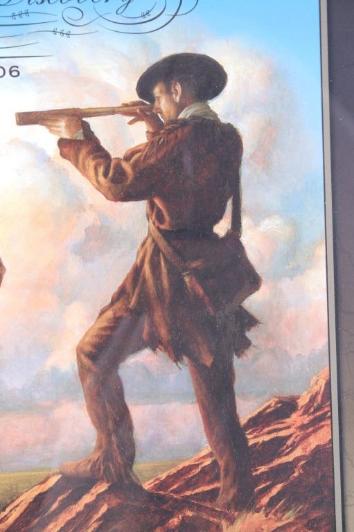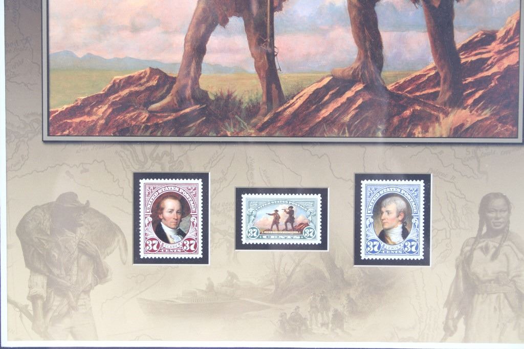 For your consideration is this Lewis and Clark: The Corps of Discovery framed art. This framed artwork features Lewis and Clark front and center as they look over the plains. One is holding a handheld telescope and the other pointing into the distance with his right hand and holding his rifle in his left. Above them in yellow lettering reads, "Lewis and Clark" and below that in black lettering reads, "The Corps of Discovery 1804-1806". Below the art are three of the USPS specialty stamps from 2004, honoring Lewis and Clark and their discoveries and adventures. One stamp features Lewis's face, the other Clark's face and the middle stamp shows the same art as shown above it. The background is of a map and features a drawing of Sacajawea, a camp scene and river scene, and a man holding his freshly hunted deer. The print is single matted and set in a metal frame behind glass. The print and frame show good condition, with only a slight crack in the bottom right of the glass. The print measures 13 1/4" L x 10 1/4" W. The entire piece measures 17" L x 13" W.