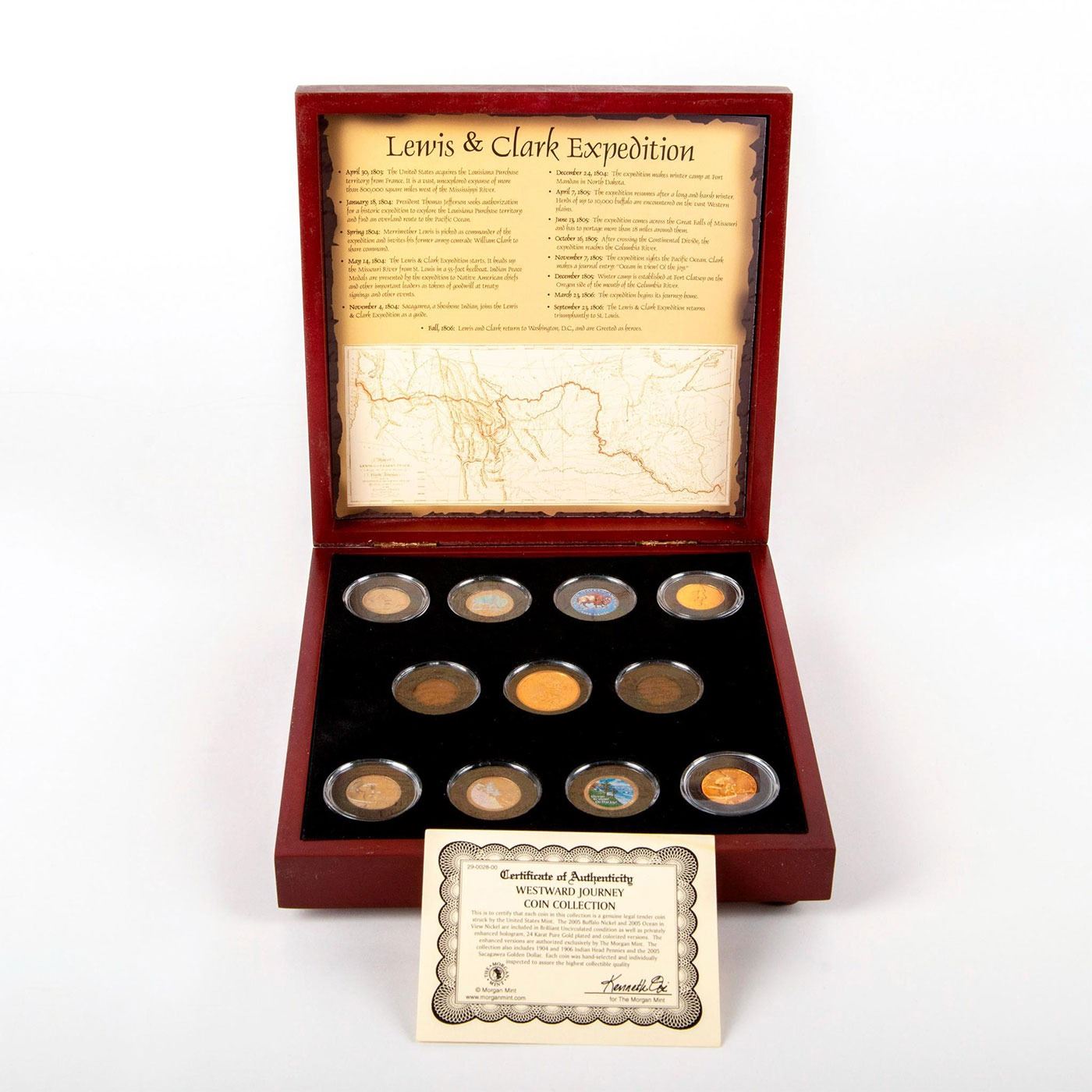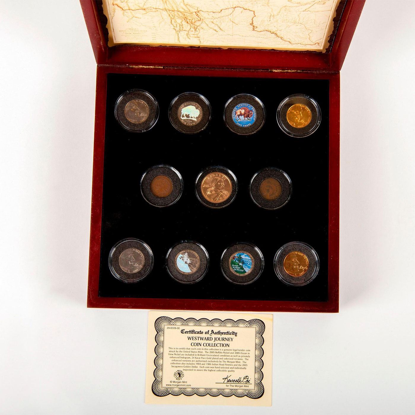 The 2005 Buffalo Nickel and 2005 Ocean in View Nickel are included in Brilliant Uncirculated condition as well as privately enhanced hologram, 24K Pure Gold plated and colorized versions. Comes in original box. Includes Morgan Mint Certificate of Authenticity. One foot on the wooden box is missing. Good condition. The collection also includes 1904 and 1906 Indian Head Pennies and the 2005 Sacagawea Golden Dollar. #Numismatists #coin #currency