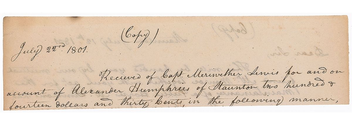Explorers who undertook a two-year expedition in 1804 to discover a navigable route to the Pacific Ocean, in the process exploring and later describing much of the course along the Missouri River. Partial ADS, signed “Capt. Meriwether Lewis,” in the text, one page, 8 x 2, July 22, 1801. This upper portion of a larger page bears retained copies of a receipt on one side, and the beginning of a letter on the reverse. The receipt reads, in full: “Recieved [sic] of Capt. Meriwether Lewis for and on account of Alexander Humphries of Staunton two hundred & fourteen dollars and thirty Cents, in the following manner.” The letter portion on the reverse reads: “(Copy) Staunton July 12th 1801. Dear Sir, This will be handed you by our mutual friend Mr Monroe together with your ac[coun]t. for the maintainance [sic] of a Public Horse Mr. Simmons has.” In fine condition, with some slight toning and mild show-through from writing on opposite side.