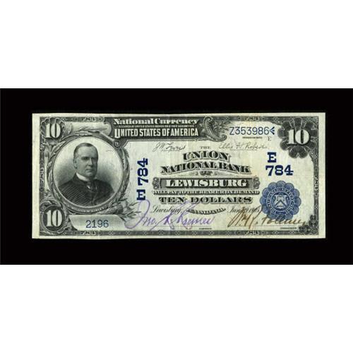 <B>Lewisburg, PA</B></I> - $10 1902 Date Back Fr. 616 <B>The Union NB</B></I> Ch. # (E)784<BR> A somewhat more elusive issue in large size with this the only $10 Date Back known. Pleasing <B>Very Fine</B></I> with bright signatures and solid margins.<BR><BR><b>Shipping:</b> Coins & Currency (<a target="_blank" href="http://www.heritageauctions.com/common/shipping.php">view shipping information</a>)