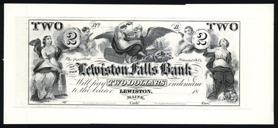 Lewiston, Maine, 18xx (printed originally in the 1850-60's, this note is ca. 1960-70's), $2, (ME-38G4c), Modern ÒProprietary ProofÓ. allegorical women on left and right, eagle with woman, ships, bales cotton and cornucopia top center, cherubs holding numerals flank central vignette, Black printing without underprint, printed on thin white card, RWHE - NEBNC and ABNC monogram. (ABN Commemoratives, AIA XI, May 15, 2012)