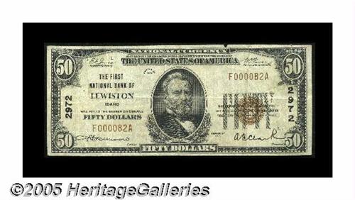 <B>Lewiston, ID</B></I> - $50 1929 Ty. 1 <B>The First NB</B></I> Ch. # 2972<BR>A seldom seen bank whose Series 1929 issue consisted primarily of high denomination examples. <B>Fine+++,</B></I> with a couple of miniscule pinholes and a small notch out of the top margin.