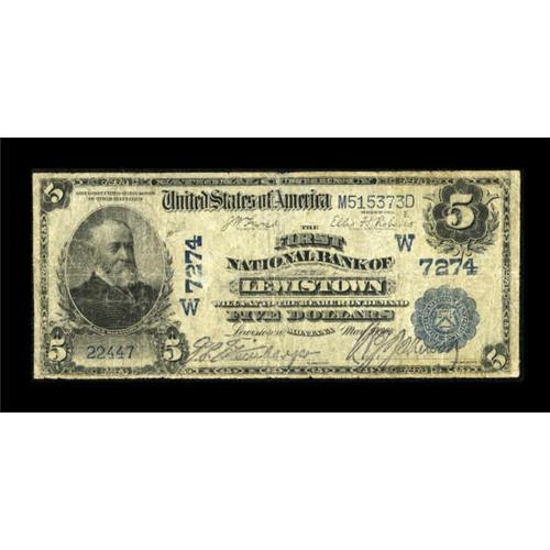 <B>Lewistown, MT</B></I> - $5 1902 Plain Back Fr. 598 <B>The First NB</B></I> Ch. # (W)7274<BR> The signatures remain bright though this example is a bit soft and displays paper weakness is spots. <B>Very Good</B></I>.<B></B></I><BR><I>From The Kansas City Collection.</B></I><BR><BR><b>Shipping:</b> Coins & Currency (<a target="_blank" href="http://www.heritageauctions.com/common/shipping.php">view shipping information</a>)