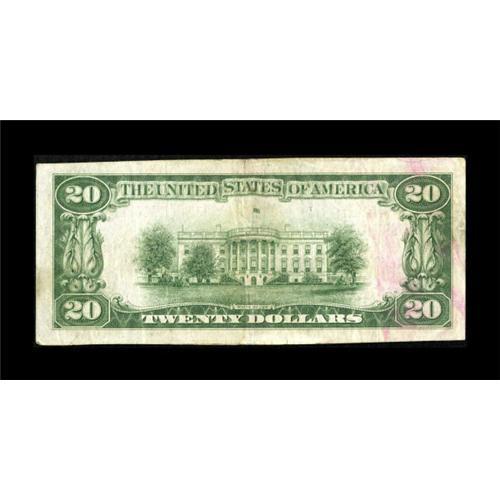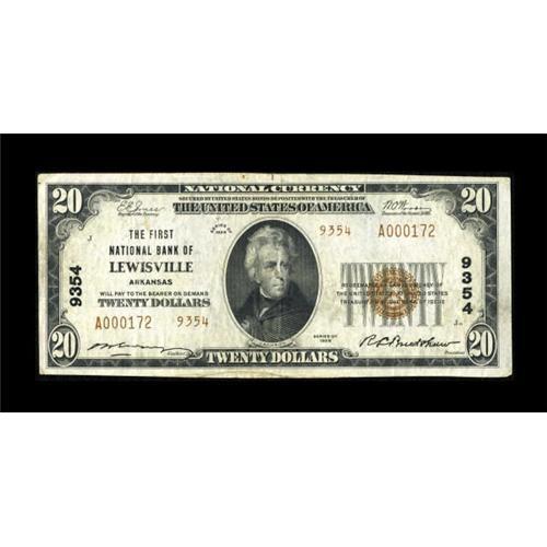 <B>Lewisville, AR</B></I> - $20 1929 Ty. 2 <B>The First NB</B></I> Ch. # 9354<BR> This is a crisp example from a tougher issuer that exhibits a couple pinholes with a light pink stain noticed on the back. Some embossing is still retained on this <B>Very Fine</B></I> note.<BR><BR><b>Shipping:</b> Coins & Currency (<a target="_blank" href="http://www.heritageauctions.com/common/shipping.php">view shipping information</a>)