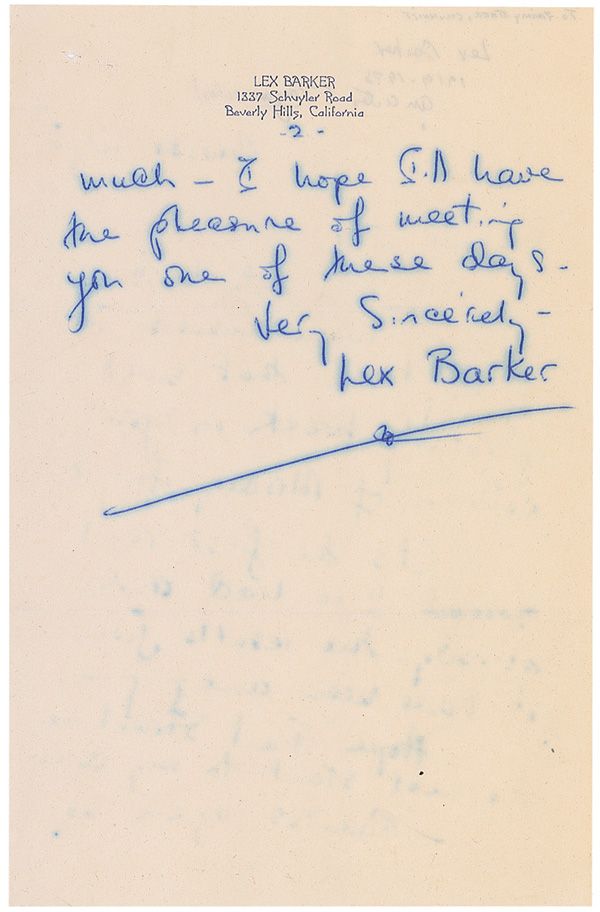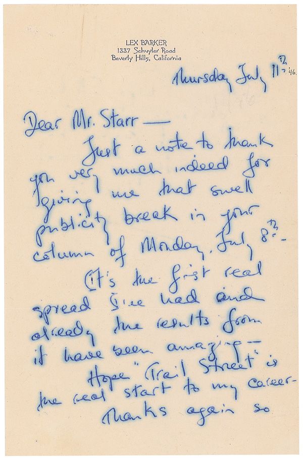 ALS, two pages, 5.5 x 8.5, personal letterhead, July 11, 1946. Letter of thanks to a columnist. In part: “Thank you very much indeed for giving me that swell publicity break in your column…It’s the real first spread I’ve had and already the results from it have been amazing—Hope ‘Trail Street’ is the real start to my career.” In very good condition, with light overall haloing to signature and text, mild shade of toning to pages, and a staple hole to top left of pages.