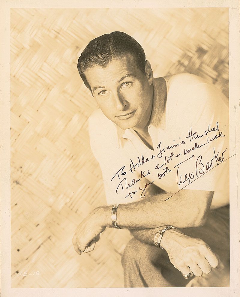 Vintage matte-finish 8 x 10 photo, signed and inscribed in fountain pen, “To Hilda & Jimmie Hanshel, Thanks a lot & much luck to you both—Lex Barker.” Scattered creases to borders, otherwise fine condition.