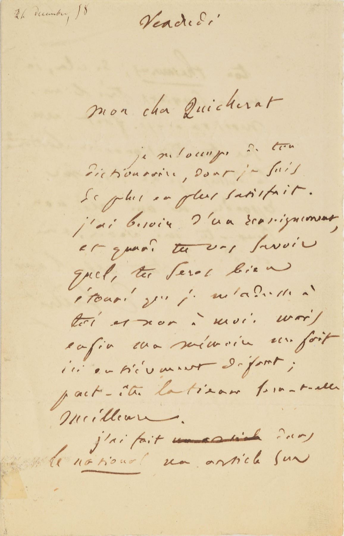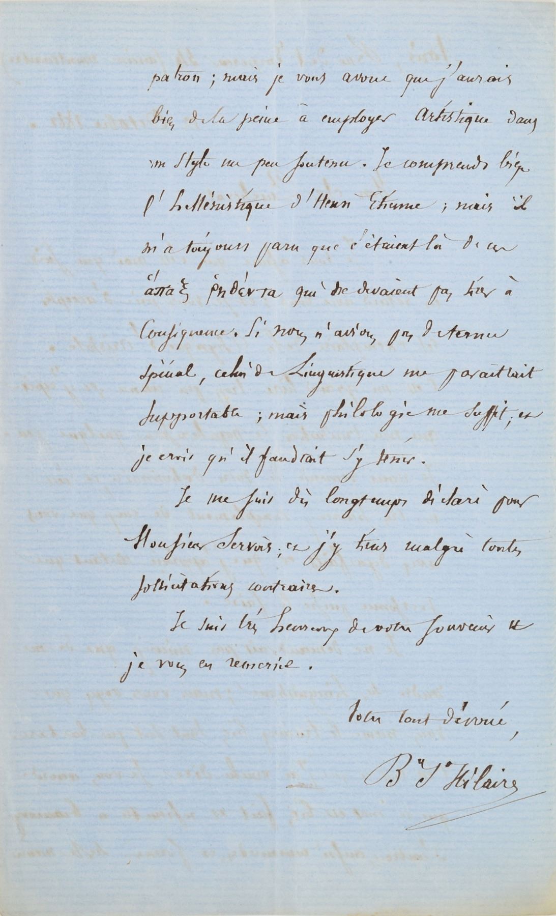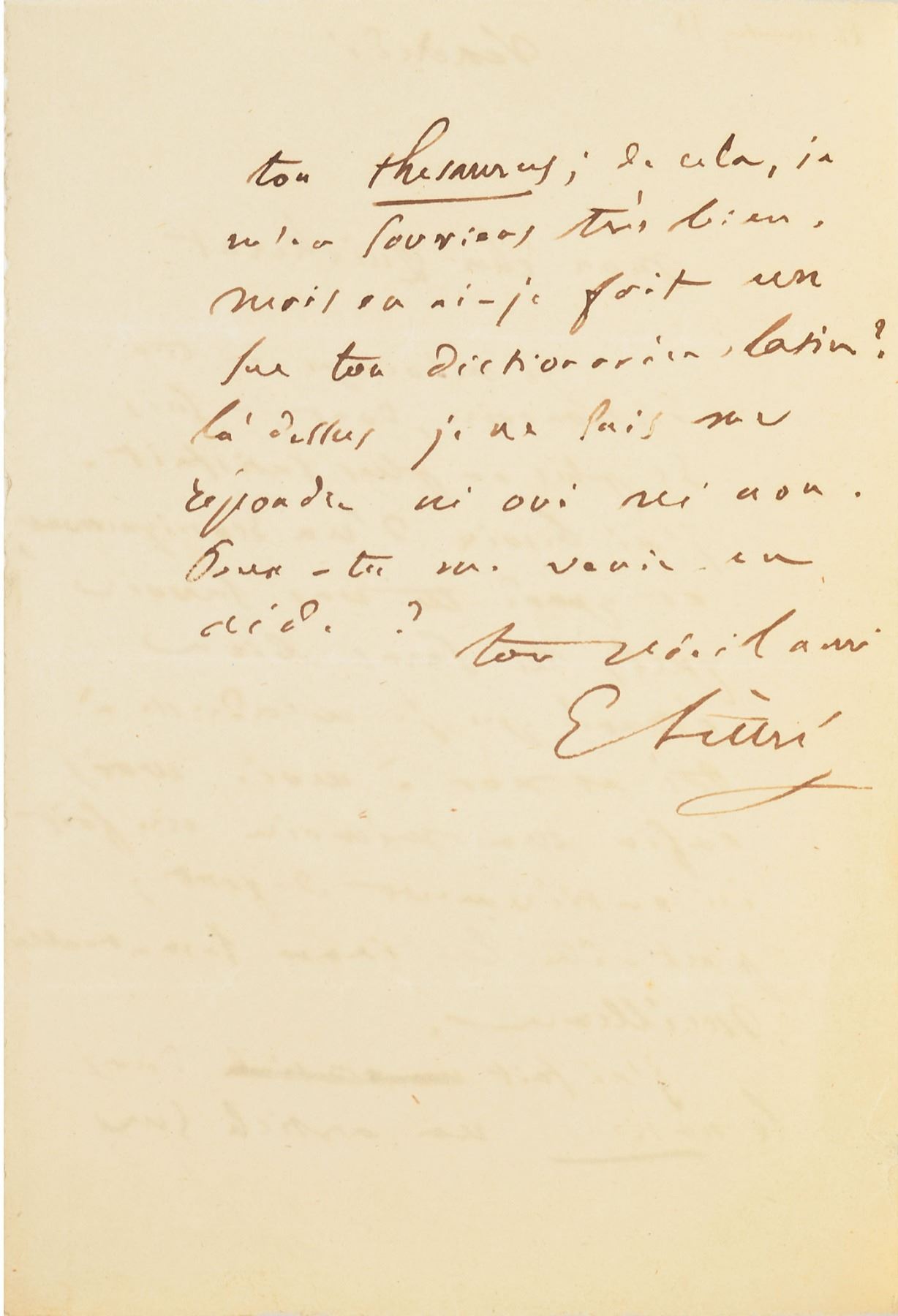 Group lot of five items signed by a notable journalist or lexicographer, including: an ALS in French from Jules Barthélemy-Saint-Hilaire, signed “B. S’ Hilaire,” one page both sides, October 12 1862, addressed to lexicographer and historian Louis-Marie Quicherat, in part (translated): “Please accept this copy of Aristotle’s ‘Physics.’ It’s a great book, too little known…I hope my translation will popularize it a bit. Thank you for your dictionary…It’s a fine complement to those you’ve already done”; a vintage matte-finish 4 x 5.5 photo of Isaac K. Funk by Alman & Co. of New York, affixed to the original studio mount, signed on the mount in fountain pen, “with compliments, I. K. Funk”; a fourth edition of H. L. Mencken’s The American Language, published by Alfred A. Knopf in 1937, signed on the first free end page in black ink, “H. L. Mencken”; and two ALSs in French from Emile Littre, both signed “E. Littre,” four total pages, dated July 1 and December 24, 1858, both addressed to Quicherat. One letter reads, in part (translated): “I turn to you in such questions because you are the master in matters of that sort. I’ve already used your dictionary quite a bit and I’m extremely satisfied…I’m neither lazy nor negligent…swamped with work”; and a selection from the other: “I’ve written an article about your ‘Thesaurus’ in ‘Le National’…I don’t remember if I wrote one on your Latin Dictionary.” In overall very good to fine condition, with a crack to lower left corner area of the Funk mount.