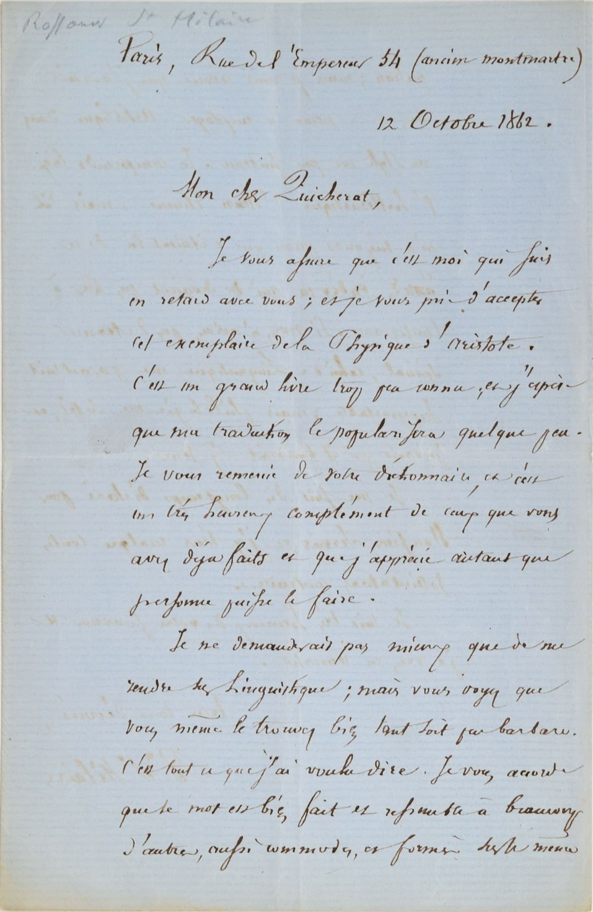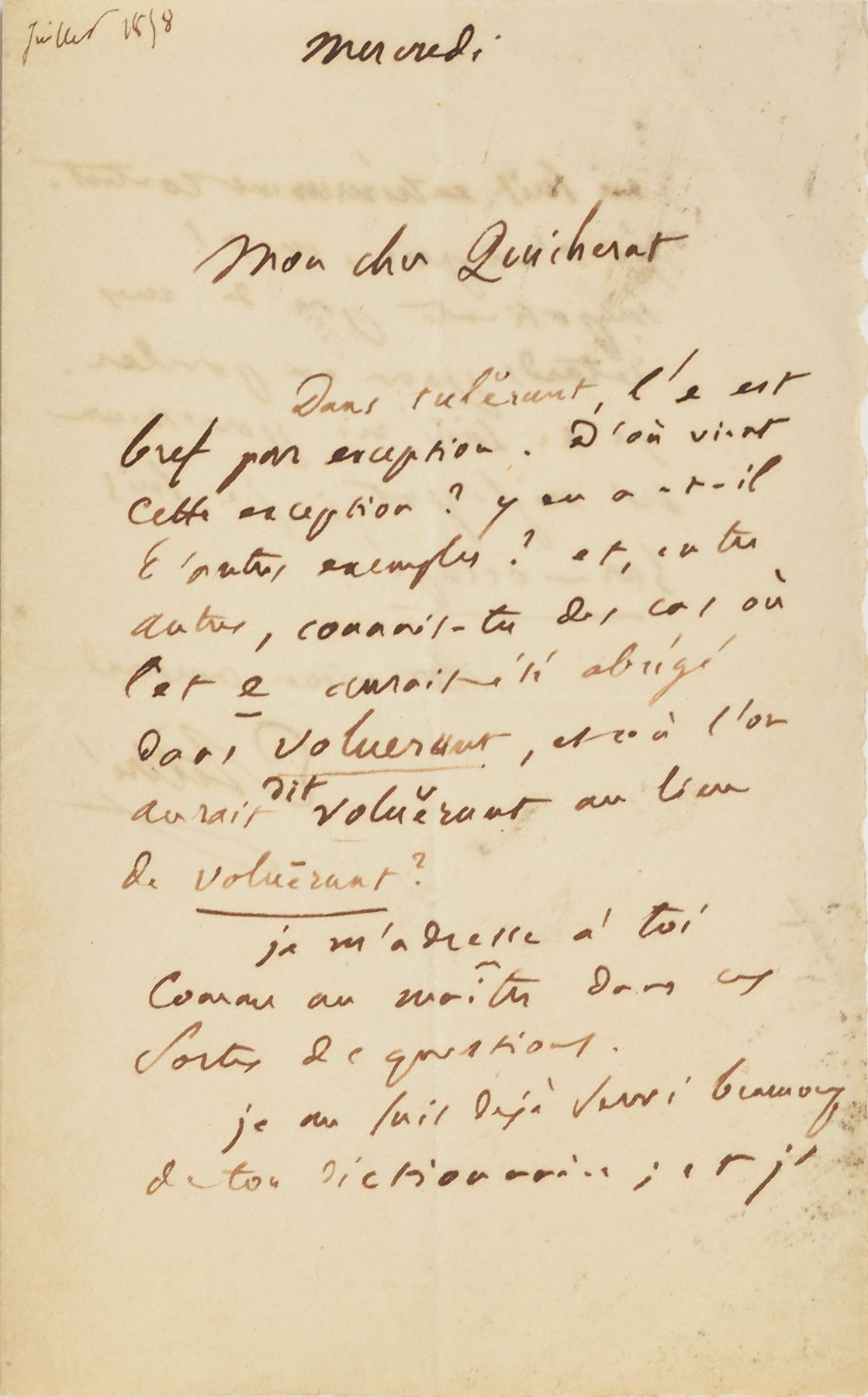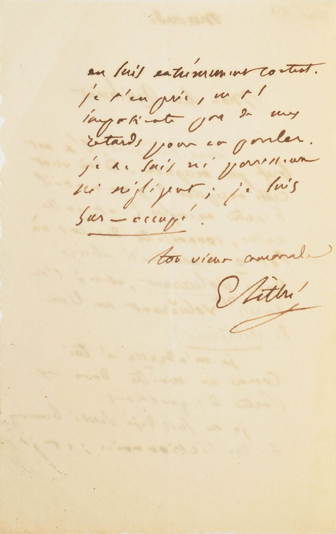 Group lot of five items signed by a notable journalist or lexicographer, including: an ALS in French from Jules Barthélemy-Saint-Hilaire, signed “B. S’ Hilaire,” one page both sides, October 12 1862, addressed to lexicographer and historian Louis-Marie Quicherat, in part (translated): “Please accept this copy of Aristotle’s ‘Physics.’ It’s a great book, too little known…I hope my translation will popularize it a bit. Thank you for your dictionary…It’s a fine complement to those you’ve already done”; a vintage matte-finish 4 x 5.5 photo of Isaac K. Funk by Alman & Co. of New York, affixed to the original studio mount, signed on the mount in fountain pen, “with compliments, I. K. Funk”; a fourth edition of H. L. Mencken’s The American Language, published by Alfred A. Knopf in 1937, signed on the first free end page in black ink, “H. L. Mencken”; and two ALSs in French from Emile Littre, both signed “E. Littre,” four total pages, dated July 1 and December 24, 1858, both addressed to Quicherat. One letter reads, in part (translated): “I turn to you in such questions because you are the master in matters of that sort. I’ve already used your dictionary quite a bit and I’m extremely satisfied…I’m neither lazy nor negligent…swamped with work”; and a selection from the other: “I’ve written an article about your ‘Thesaurus’ in ‘Le National’…I don’t remember if I wrote one on your Latin Dictionary.” In overall very good to fine condition, with a crack to lower left corner area of the Funk mount.