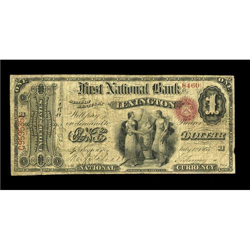 <B>Lexington, KY</B></I> - $1 Original Fr. 380 <B>The First NB</B></I> Ch. # 760<BR>A very rare type and denomination from this very scarce bank, with this the only ace reported from this bank. In fact, it is one of just two $1 First Charters listed in the census from all Lexington banks combined. Nice <B>Fine-Very Fine.</B></I>