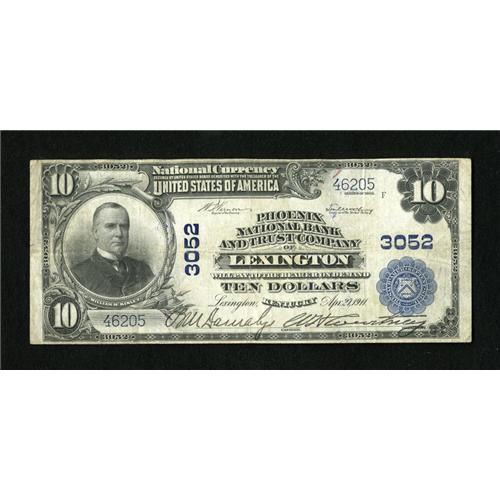 <B>Lexington, KY</B></I> - $10 1902 Plain Back Fr. 627 <B>Phoenix NB & TC</B></I> Ch. # 3052<BR>This note bears the last of the three titles this institution used on its large emissions. Dark signatures remain on this <B>Fine-Very Fine</B></I> piece.<BR><BR><b>Shipping:</b> Coins & Currency (<a target="_blank" href="http://www.heritageauctions.com/common/shipping.php">view shipping information</a>)
