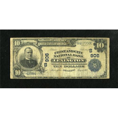 <B>Lexington, KY</B></I> - $10 1902 Plain Back Fr. 630 <B>The First & City NB</B></I> Ch. # (S)906<BR> A decent and well worn issue featuring this bank's second title. <B>Very Good.</B></I><BR><BR><b>Shipping:</b> Coins & Currency (<a target="_blank" href="http://www.heritageauctions.com/common/shipping.php">view shipping information</a>)