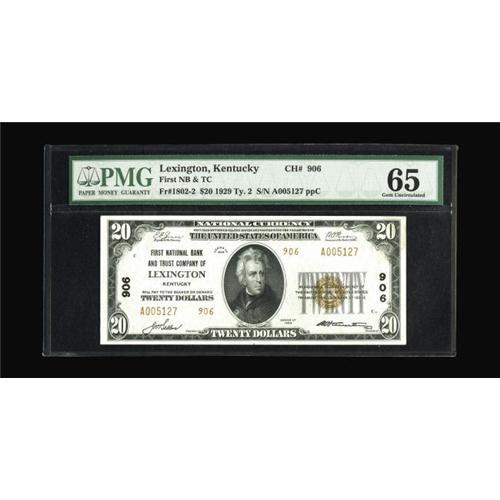 <B>Lexington, KY</B></I> - $20 1929 Ty. 2 <B>First NB & TC</B></I> Ch. # 906<BR>An ideal note for type, bearing the coveted grade of <B>PMG Gem Uncirculated 65</B></I>.. The originality of the paper is easily discernible through the encapsulation surfaces. Only nine banks in the entire state utilized the "Trust Company" appellation in their title. This certified example is certainly one of the nicest extant.