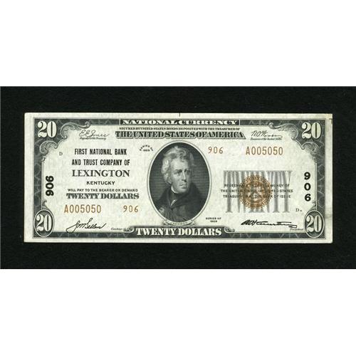 <B>Lexington, KY</B></I> - $20 1929 Ty. 2 <B>First NB & TC</B></I> Ch. # 906<BR>This well executed and wholly original issue shows a light corner bend that precludes a full Uncirculated grade. <B>Choice About Uncirculated.</B></I><BR><BR><b>Shipping:</b> Coins & Currency (<a target="_blank" href="http://www.heritageauctions.com/common/shipping.php">view shipping information</a>)