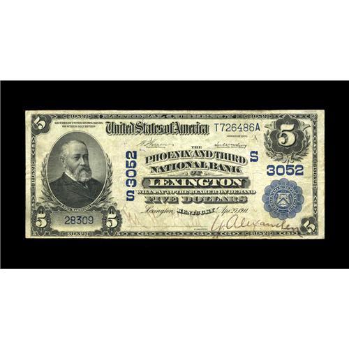 <B>Lexington, KY</B></I> - $5 1902 Date Back Fr. 593 <B>The Phoenix & Third NB</B></I> Ch. # (S)3052<BR>A nice mate to the $5 Plain Back offered below. Different officer signatures than on that example and the signatures are done with a purple, rather than black stamp. <B>Very Fine.</B></I>
